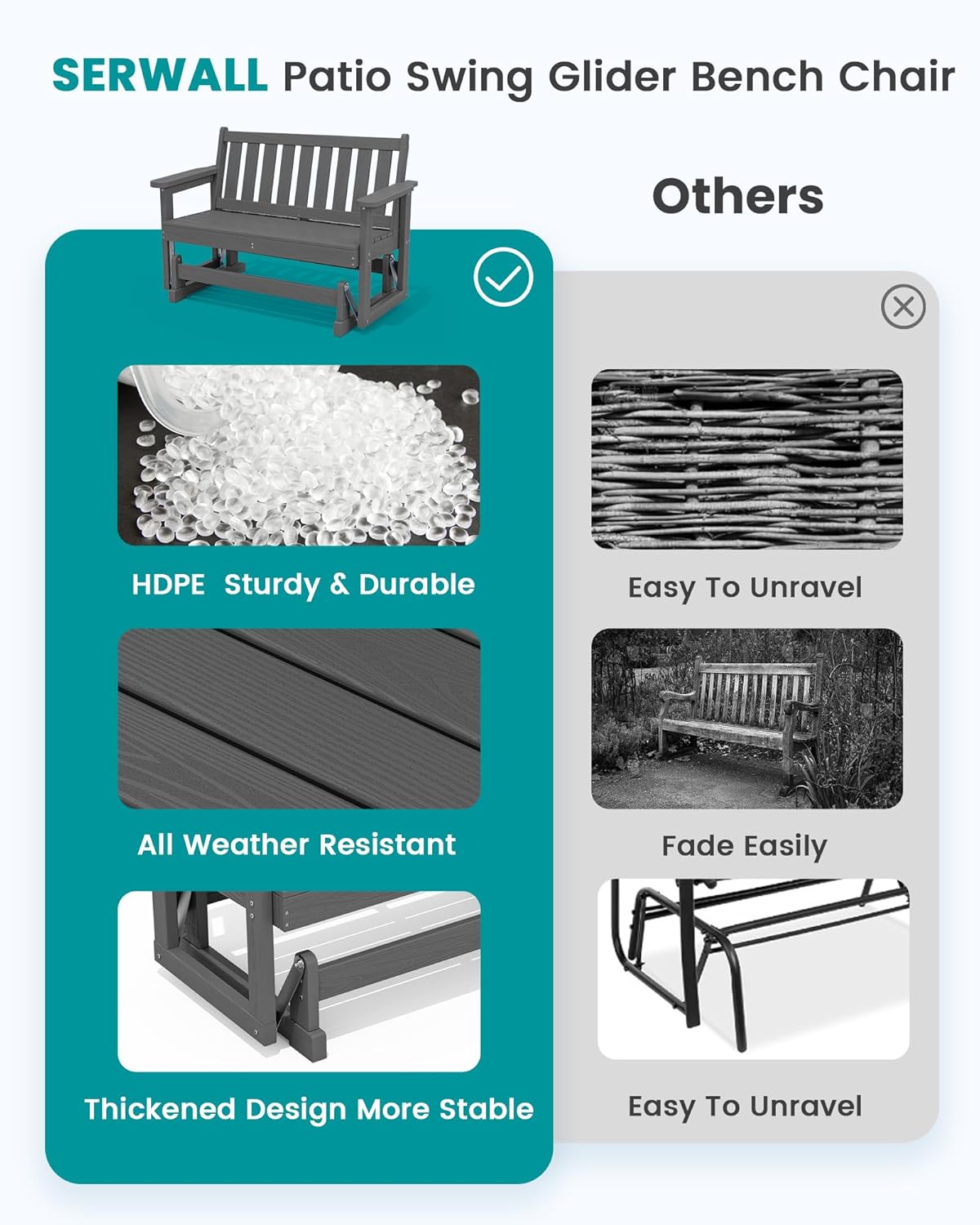 • [All Weather Resistant] Made with durable HDPE material and stainless steel hardware, the SERWALL glider rocking chair is built to withstand all weather conditions, ensuring long-lasting durability. The easy-to-clean surface and ability to swing add an extra level of comfort to your outdoor space, making it ideal for use in any outdoor setting.