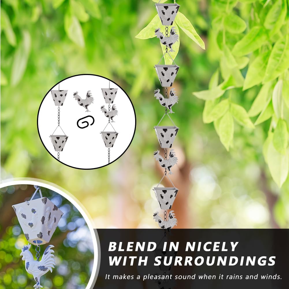 • Unique Design: The rain chain consists of 10 handmade trapezoidal cups and rooster decorations, connected by a metal chain in the middle. Hanging under the eaves, it effectively guides rainwater and decorate the house, brings excellent visual effects, making the house more elegant and beautiful. It can be used as an optional alternative to the traditional rain gutter system