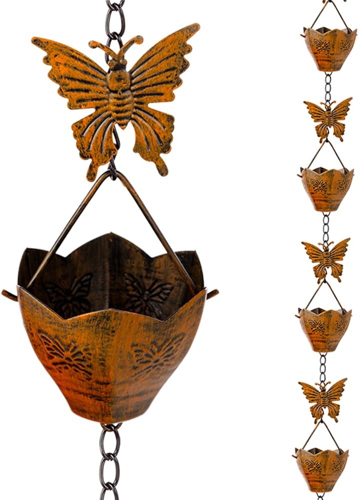 • Unique Design: The rain chain consists of 12 handmade lotus cups and butterfly decorations, connected by a metal chain in the middle. Hanging under the eaves, it effectively guides rainwater and decorate the house, brings excellent visual effects, making the house more elegant and beautiful. It can be used as an optional alternative to the traditional rain gutter system
