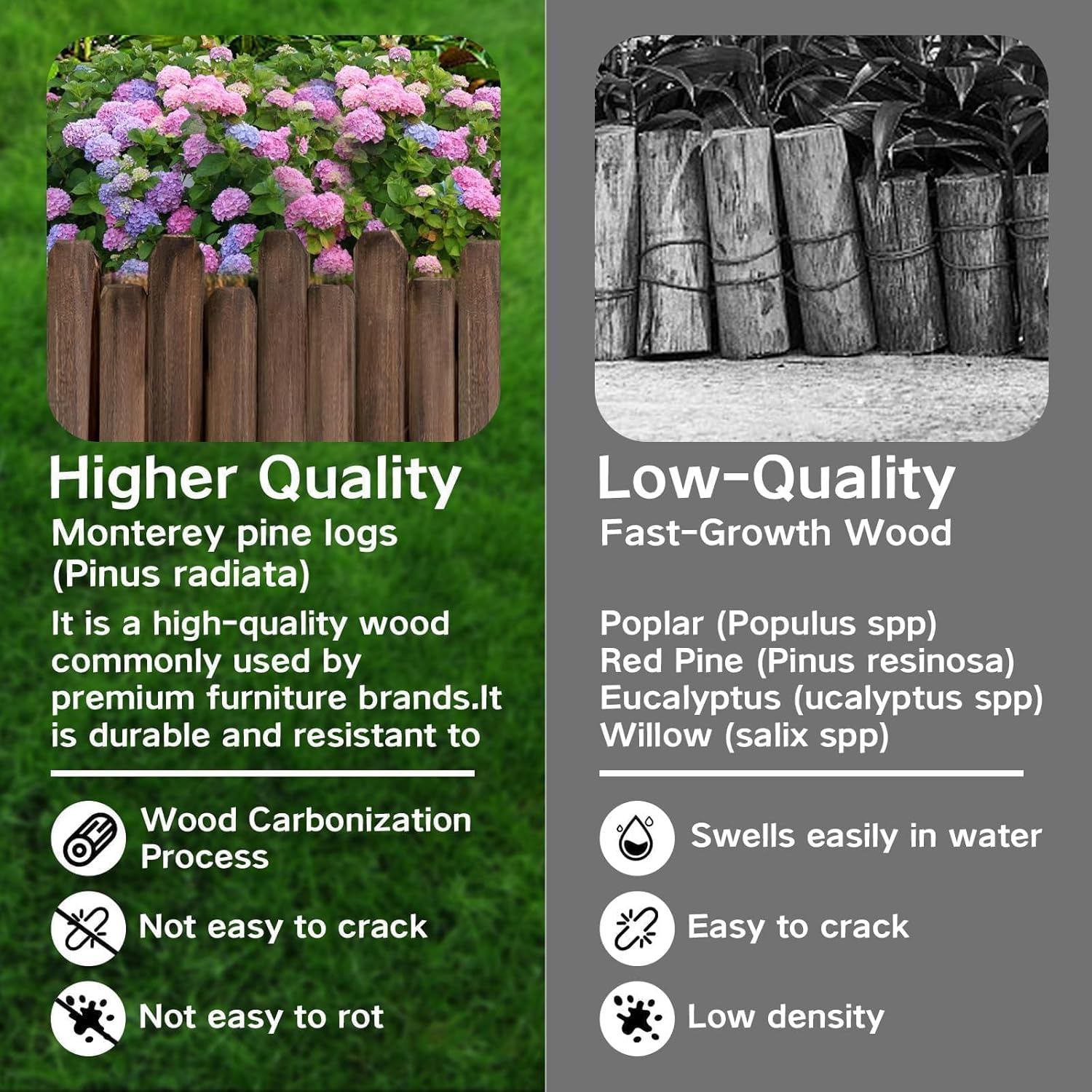 • Durable: The wood garden fence after a carbonized process and processing, the wood landscape edging border won't crack, warp, yellow, or splinter. No painting, staining or maintaining required.