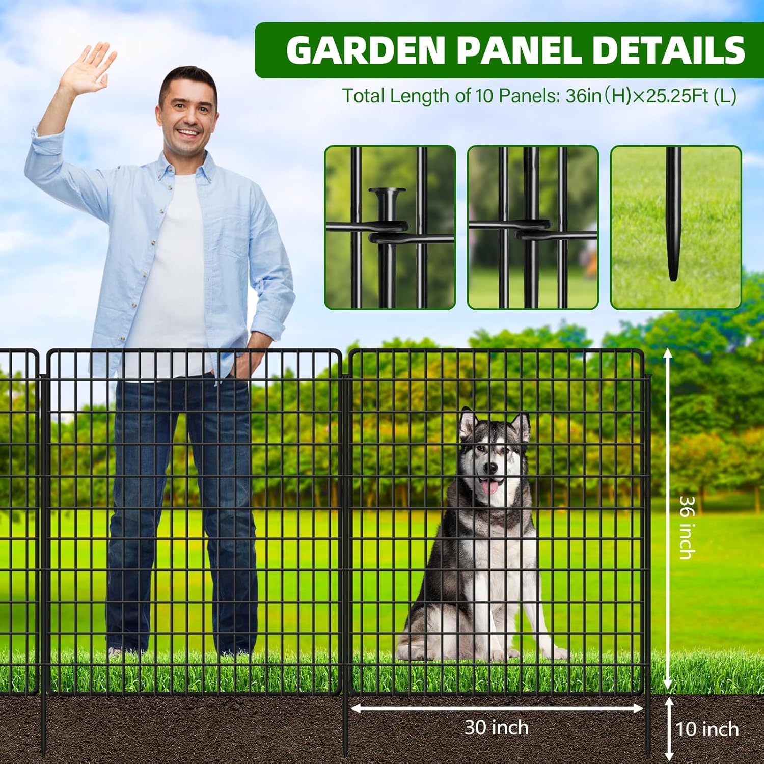 • Dog Fence for Yard --- Each panel of the dog fence measures 36" H x 30" W, can be connected and expanded into different shapes based on your specific needs. Upgraded to 36-inch heightening design to prevent large dogs from entering the garden.
