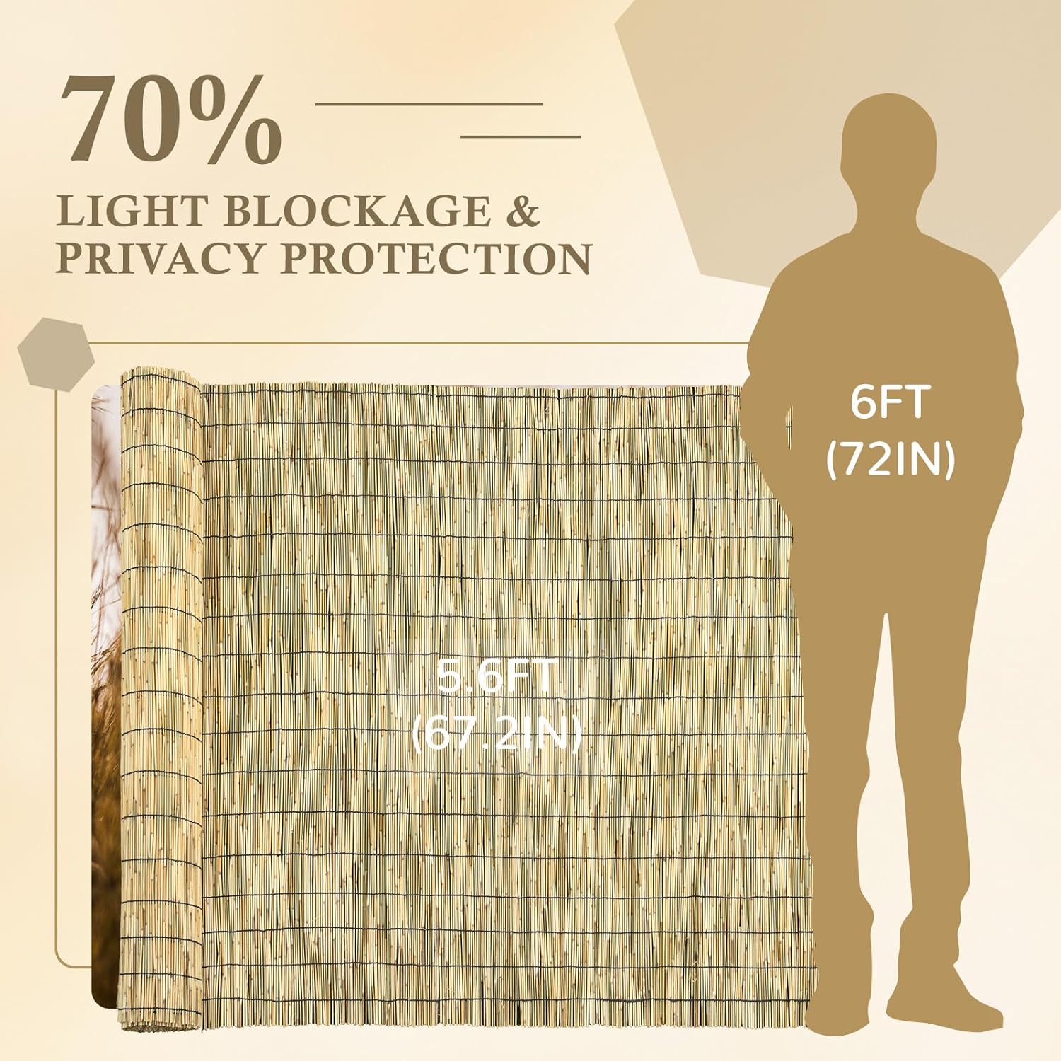 • Product Features: The bamboo reed fence roll is 5.6 feet high and unfold to a length of 16.4 feet. They are designed to conceal unsightly bins, fences, or other objects, while also enhancing privacy for backyards, balconies, patios, or swimming pools