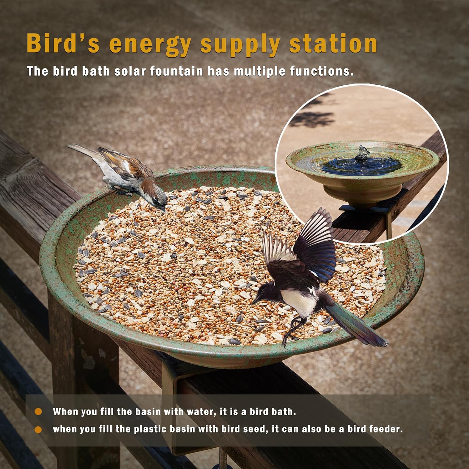 • IDEAL GIFT:The solar deck bird bath attracts birds to your garden, bringing us closer to nature,it is definitely a sight to behold when your feathered friends come to play in the birdbath, enjoy a bath or drink water. Buy this outdoor bird bath as a gift for friends, family, bird lovers. Definitely a perfect choice.