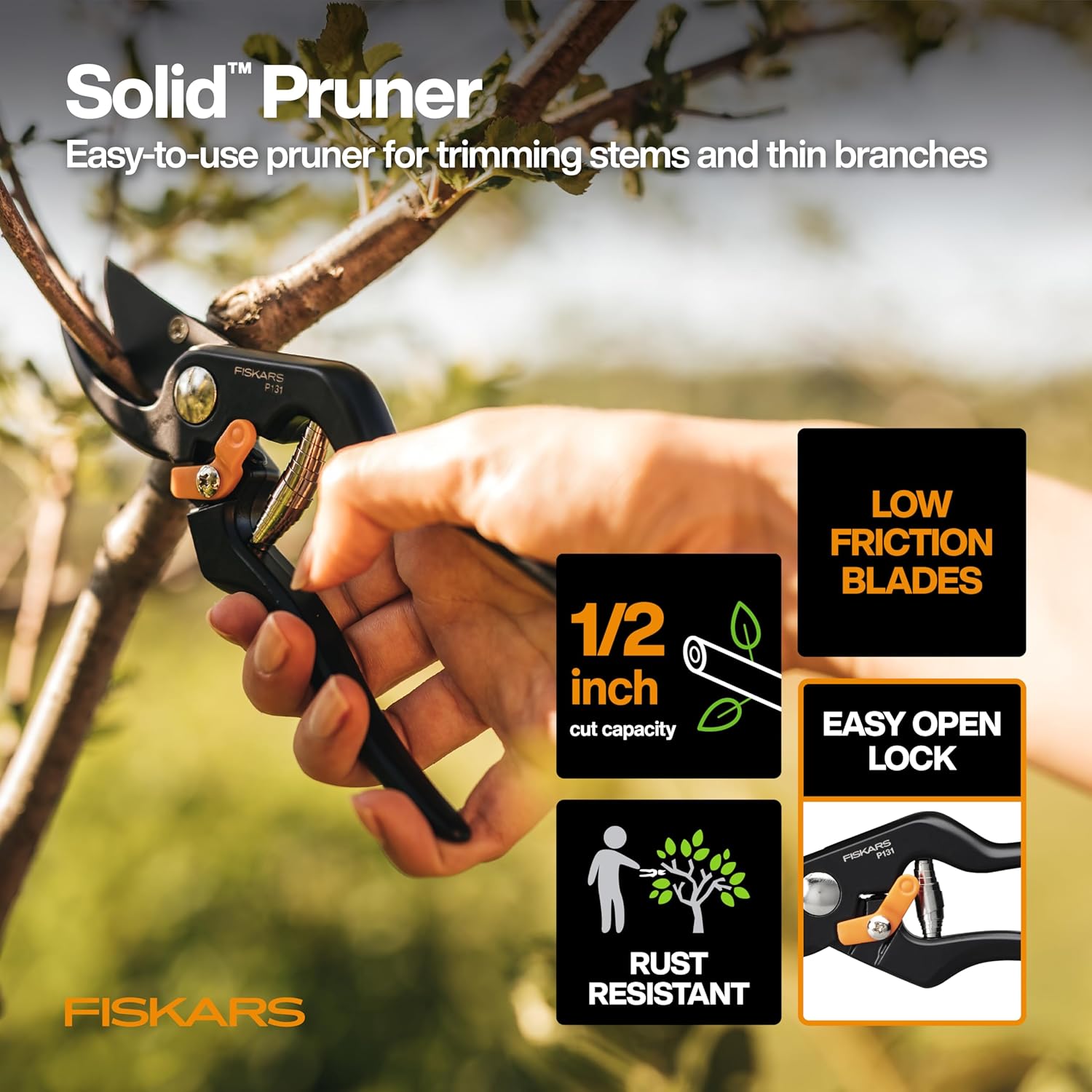 • Pruner blades are made of precision-ground steel and feature a low-friction coating that resists rust and gumming, while the durable, cast-aluminum handle includes an easy-open lock to protect the blade during transport and storage