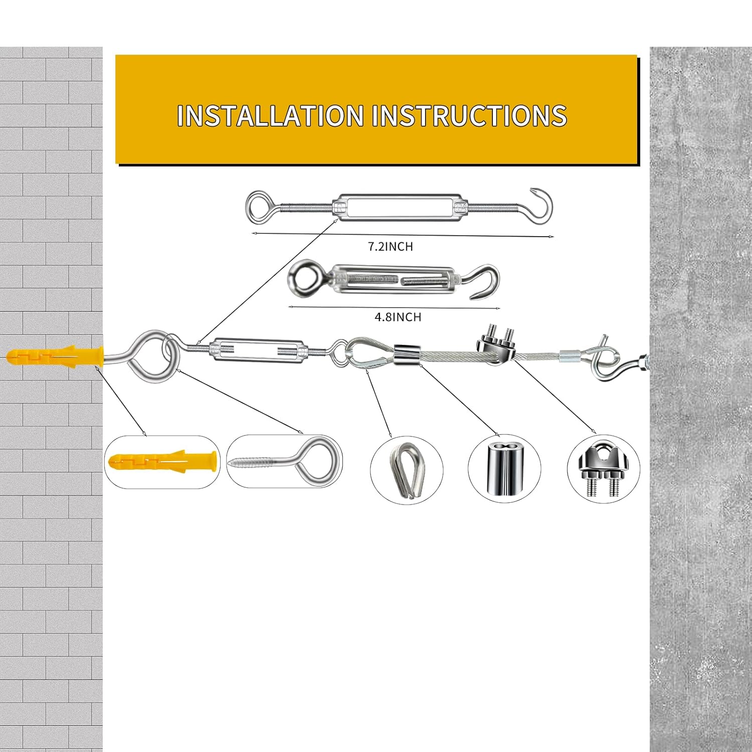 • 【Easy to install】: spring snap hooks for quick and secure connections,eye hooks with screws and wall anchors for a variety of anchoring options.8 wire rope clips that are designed to securely fasten the cable at any point along its length.10 aluminum sleeves and 10 wire rope thimbles to provide a smooth and snag-free cable path.5 adjustable turnbuckles included,you have the flexibility to make precise adjustments to the tension of your wire rope setup.
