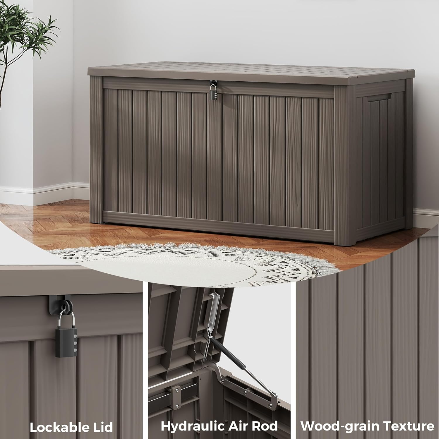 • ALL WEATHER RESISTANT - Weatherproof resin makes this outdoor storage box waterproof, rustproof, corrosion resistant and extremely low maintenance; its wood grain complements any décor; NOTE: The colour of the storage box may vary in different scenarios, with darker colours indoors and lighter colours outdoors; to avoid accidents, please remember to remove all stored items before moving the storage box!