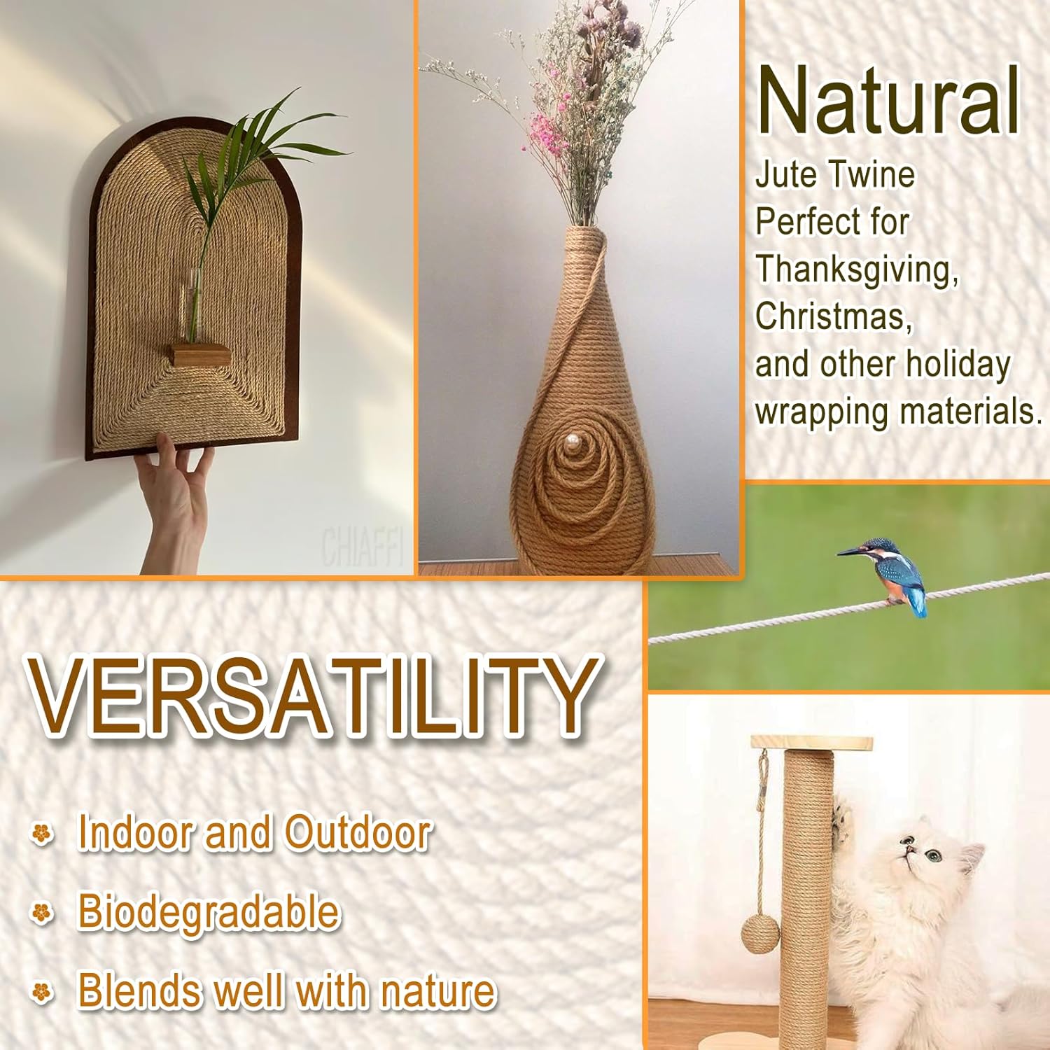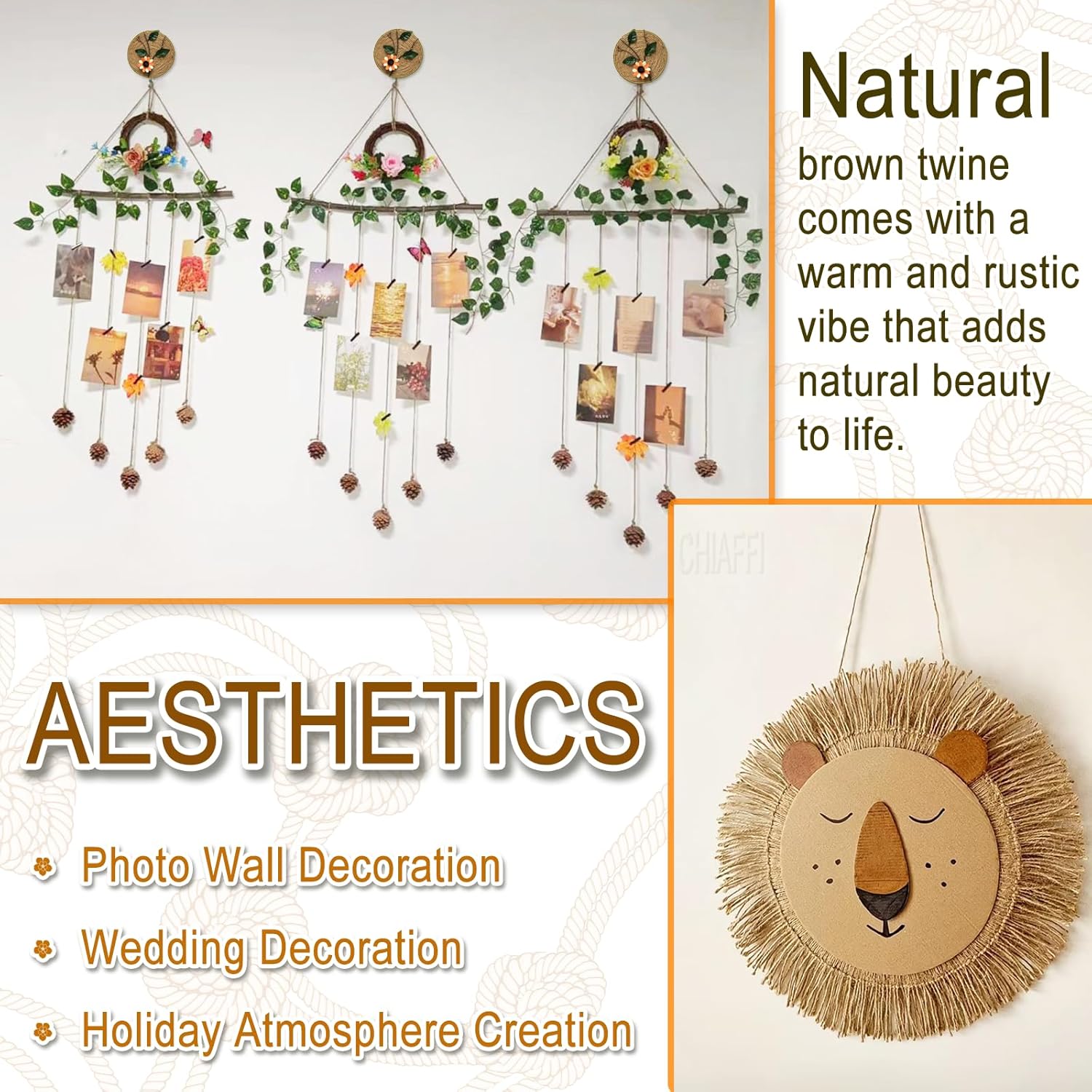 • AESTHETICS - Make a pretty gift wrap, gift card string, photos string, art crafts and DIY projects - such as bracelets and necklaces. For wedding, birthday, baby shower and more, to create a handmade rural style decoration. Natural Jute Twine Perfect for Thanksgiving, Christmas, and other holiday wrapping materials.
