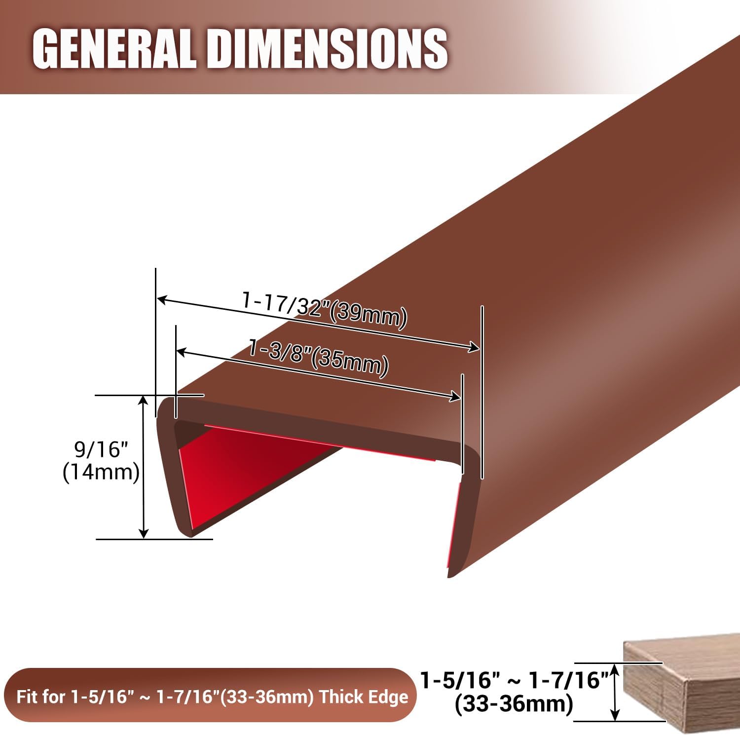 Rubber Edge Trim, Flexible Self Adhesive U Shaped Peel and Stick Edge Banding, 1-3/8"(35mm) U Channel Edge Protector for Door Sides, Edge Guards for Woods, Furniture, 20Ft, Brown Color