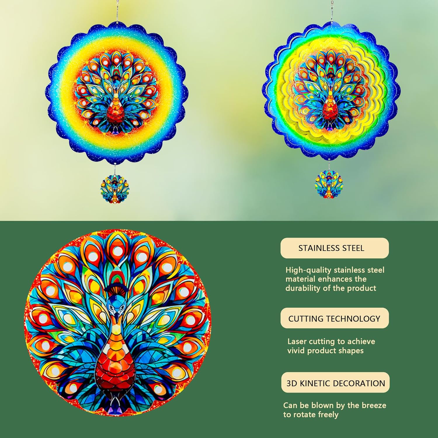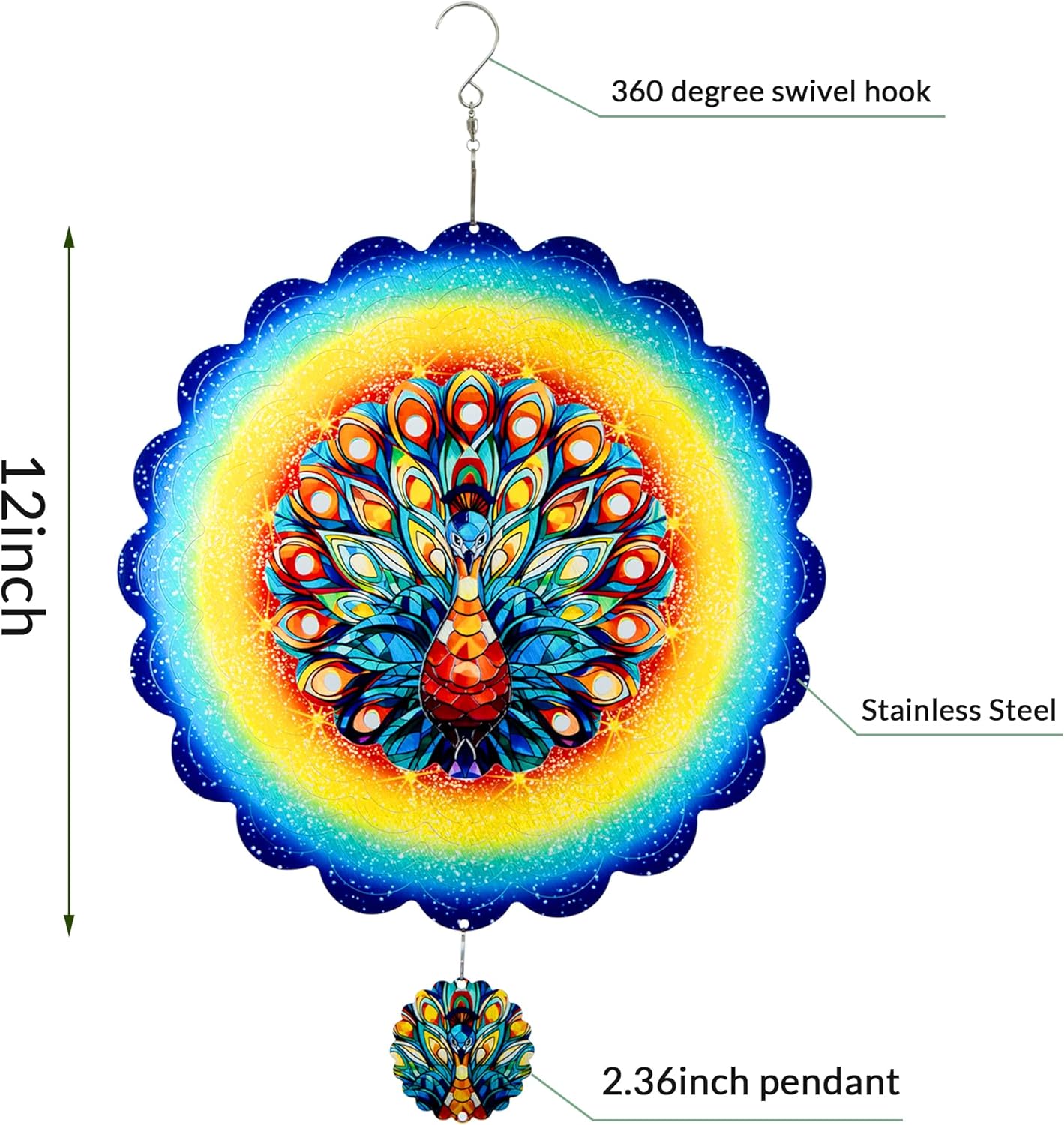 • 【Product introduction】: This 3D wind spinner is made of 12 inches and made of high-quality stainless steel. which adopts cutting technology and PUV printing to achieve a vivid peacock shape.
