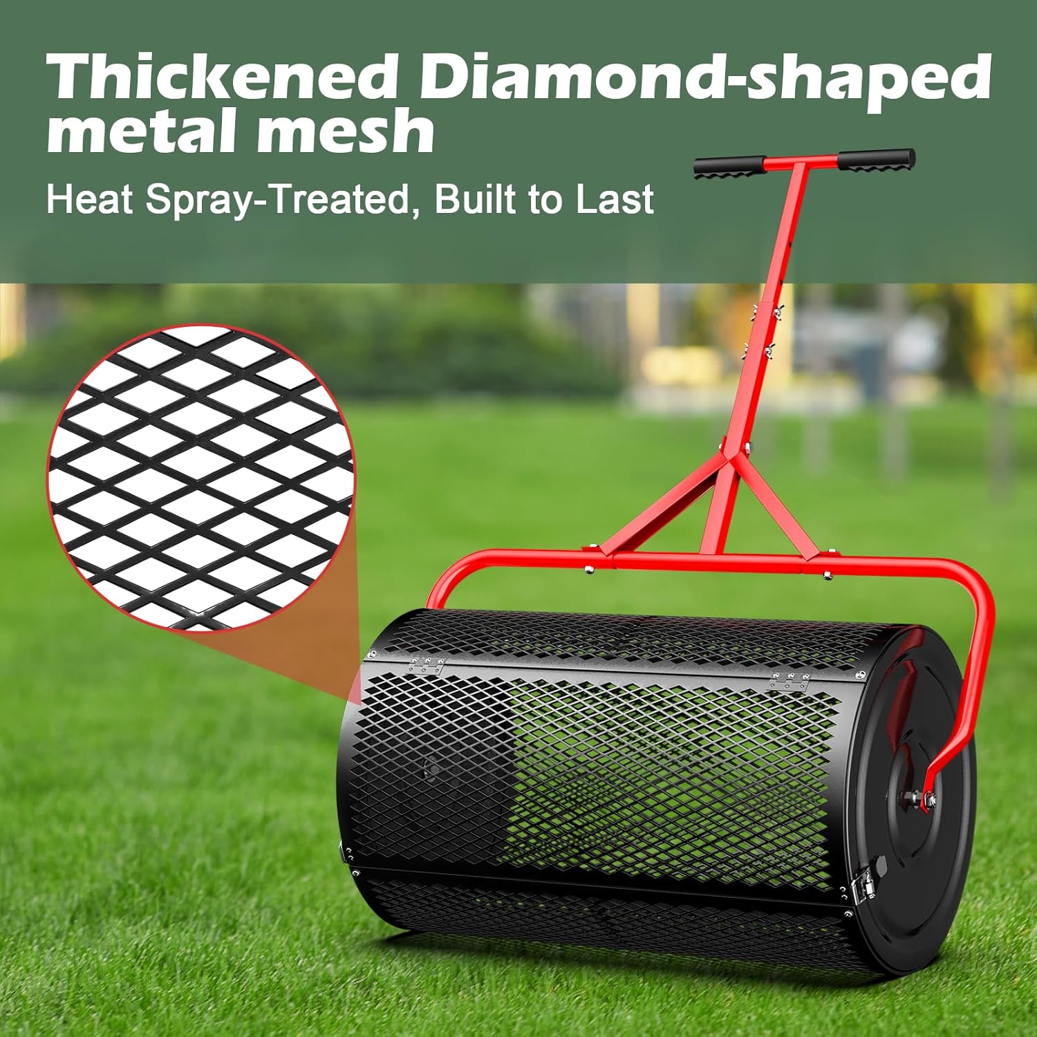 • [Thickened Diamond-Shaped Metal Mesh] Featuring a thickened diamond-shaped metal mesh, this peat moss spreader for lawn is built for durability. The robust metal frame coated with a thermal spray finish ensures it withstands frequent use, supporting your garden maintenance with reliability.