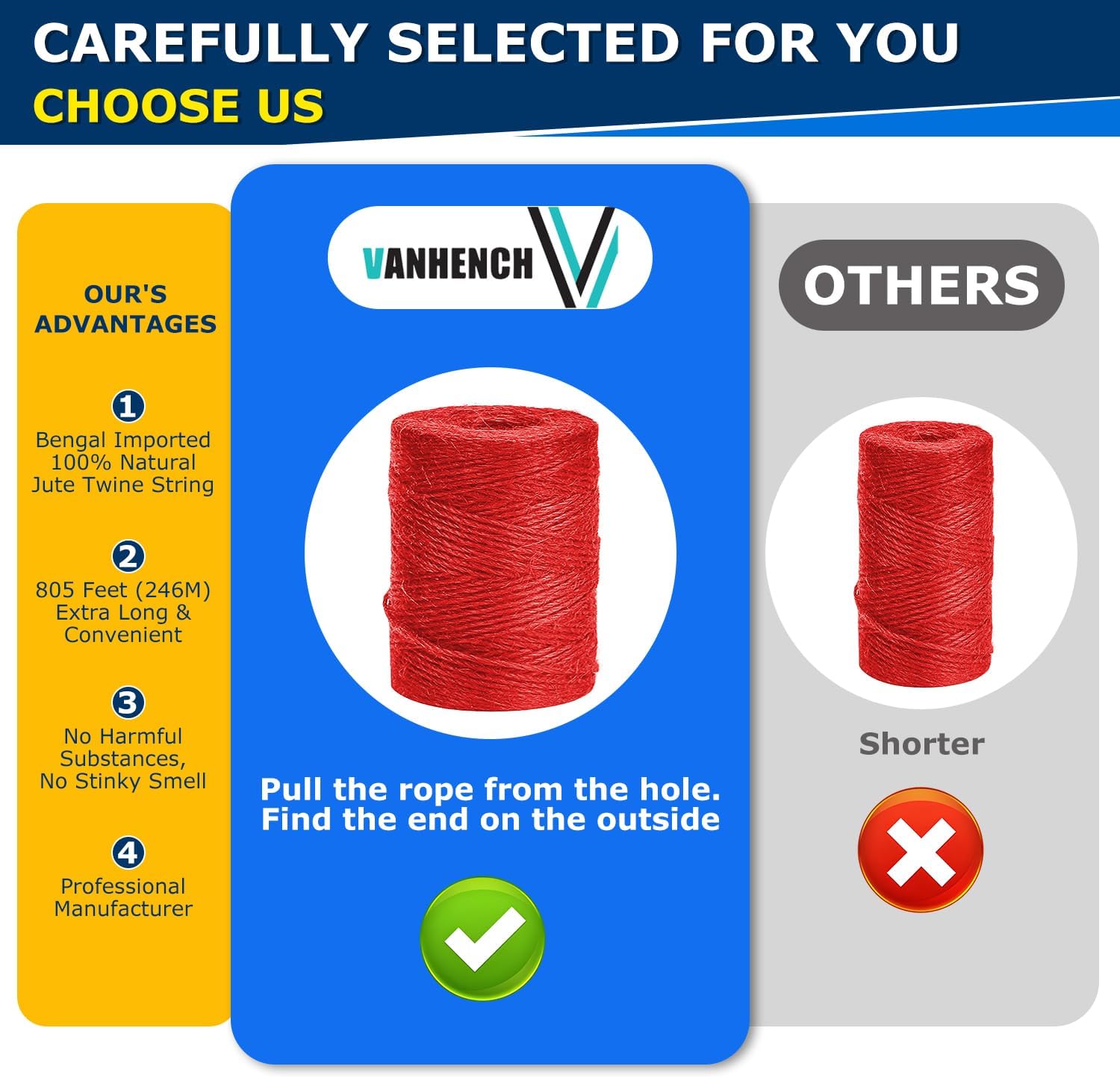 Vanhench 805ft Wrapping Twine String, Red Colored Natural Jute Twine Cord Thin Rope, Arts & Crafts Gift Wrapping, Wedding Décor, Art Decoration Packing Material, Bracelet String