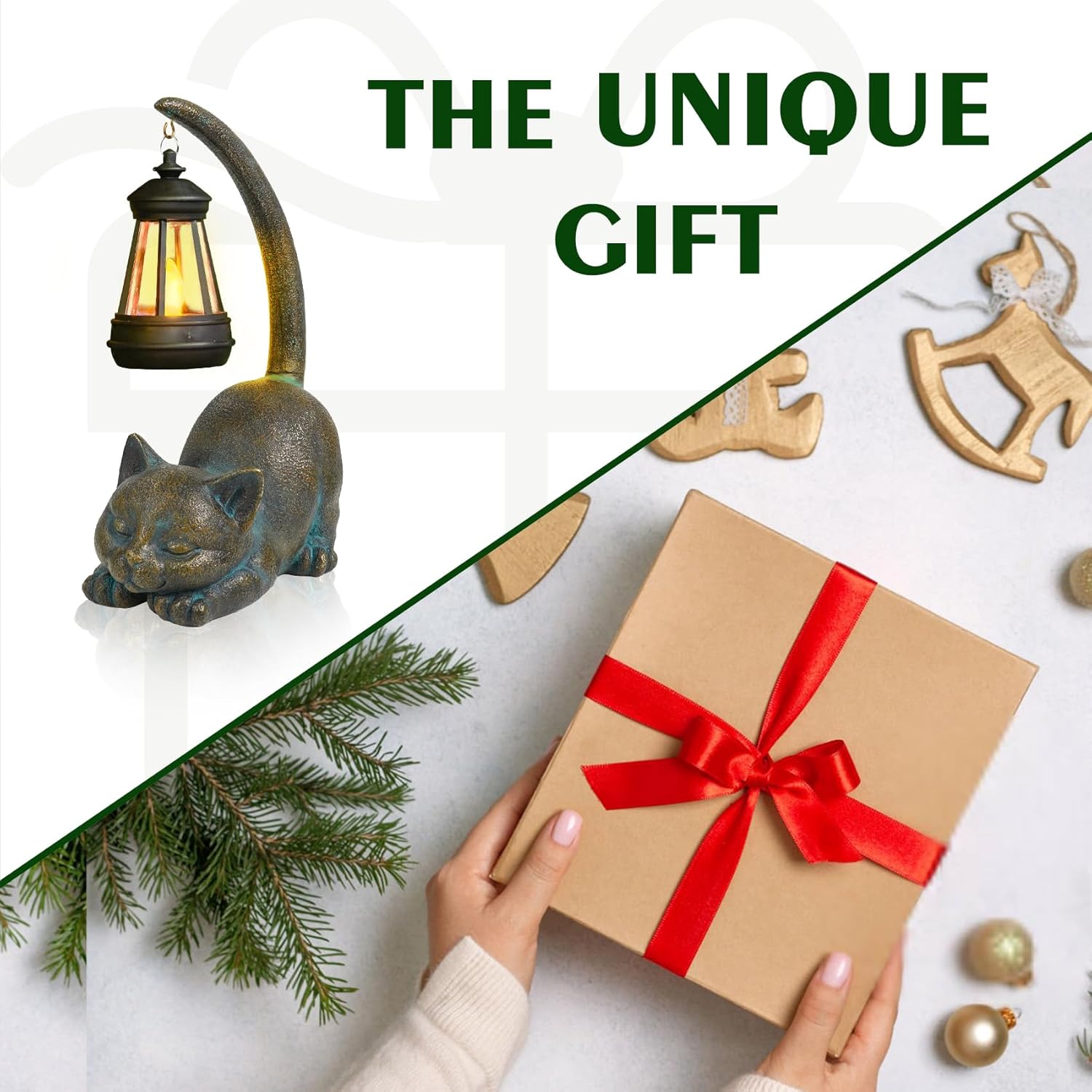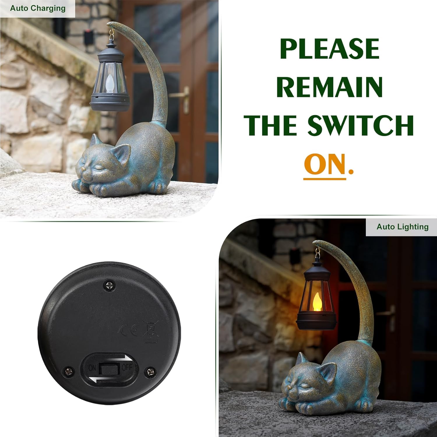 • Original Design:This bronze cat statue features delicate textures and a lantern dangling from its tail, emitting a flickering, flame-like light. Size: 3.94"W x 6.69"D x 10.03"H. Note: The tail comes disassembled and requires simple assembly