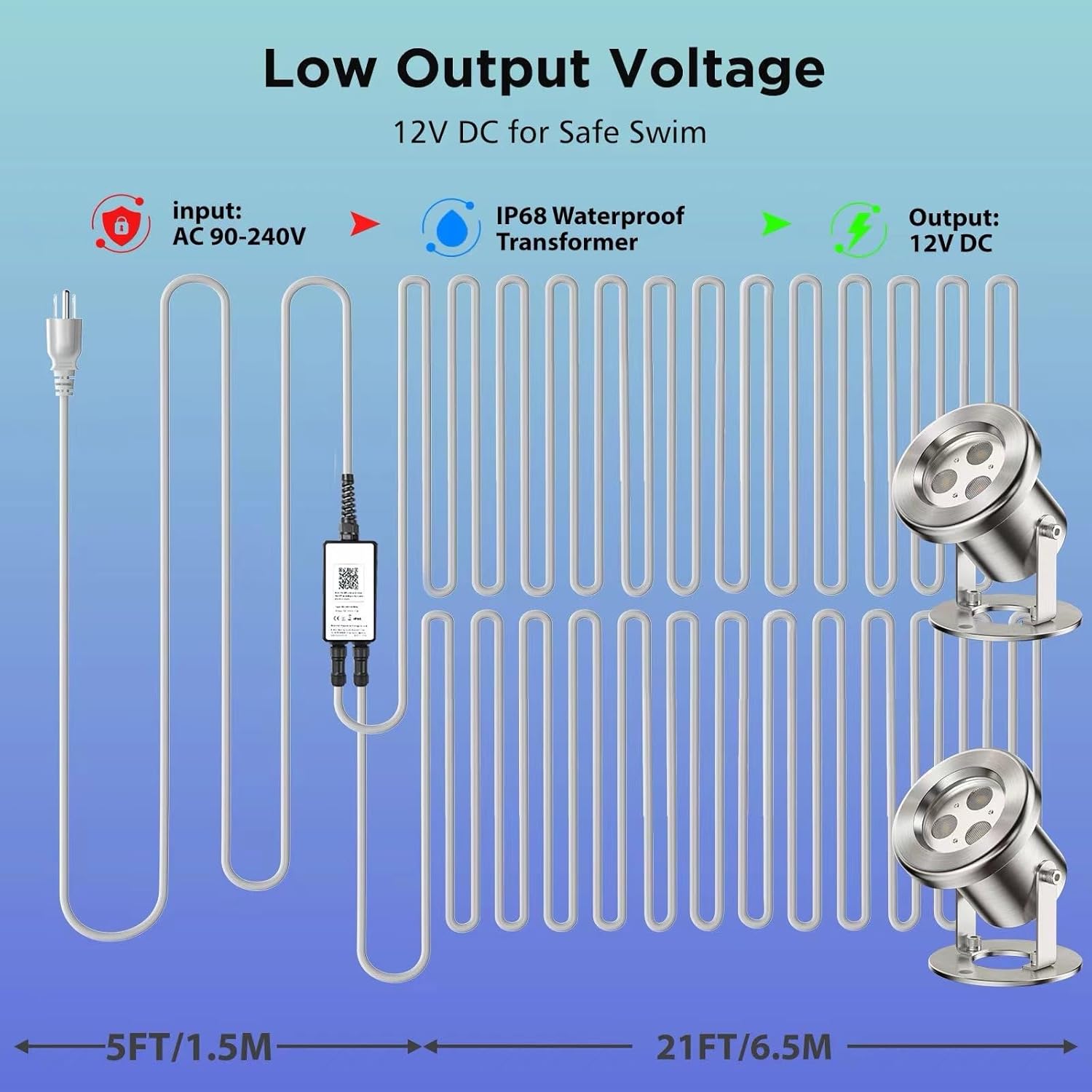 • 12V Low Voltage Safe Underwater Lights- Our 12V low voltage LED pond light has a transformer built into the fixture, no need connect to extra transformer. Buying submersible pond light kit that last longer all at once saves you time and money.