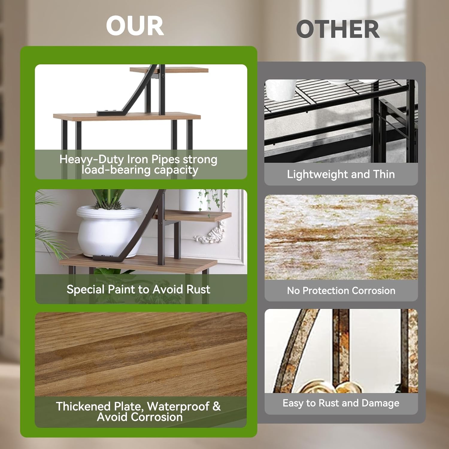 • 【More Stable & Sturdy Plant Shelf】The frame of this indoor plant stand is made of heavy-duty iron pipe that is 1.2mm thick, ensuring a robust structure and strong load-bearing capacity. The surface of the iron pipe is coated with special baking paint to avoid rust. Each layer consists of thickened(12mm) particleboard offering resistance to cracking and coated with water-resistant layer to avoid corrosion, warping and curling caused by residual water.