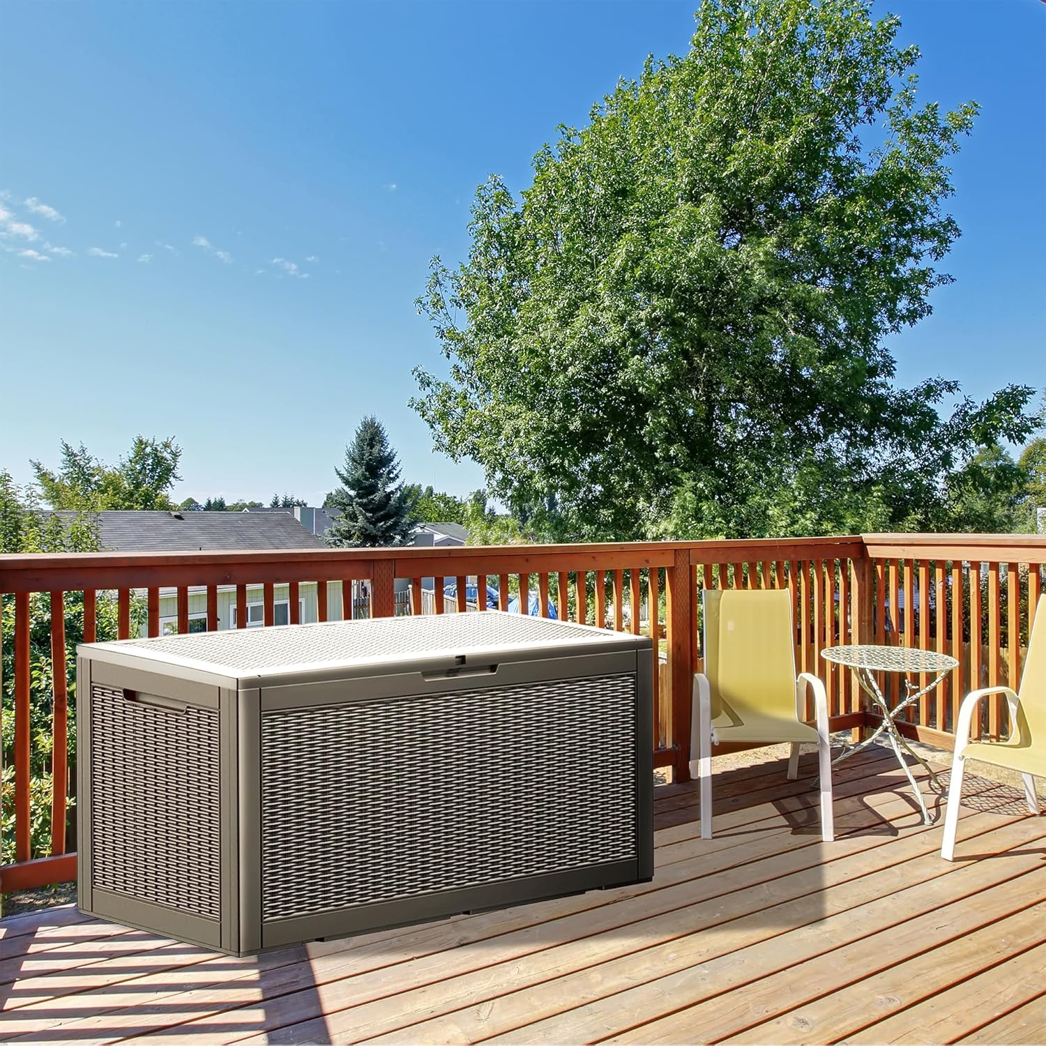 • High-Quality Resin Material:Constructed from the latest high-quality resin, this deck box is waterproof, UV-resistant, anti-fading, and anti-bending, ensuring durability for long-term outdoor use.