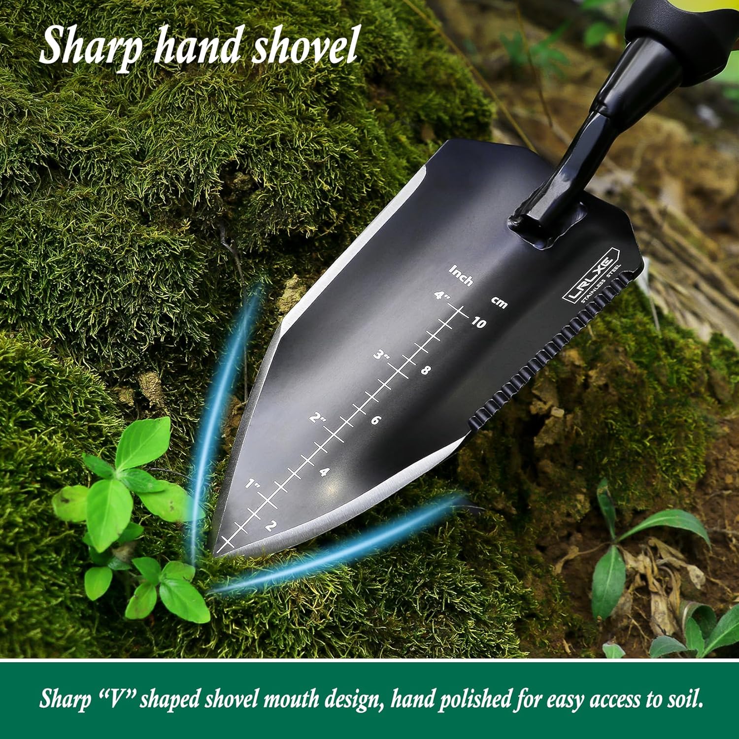 • The sharp "V" shaped spade opening is hand polished for easy access to the soil, has a serrated edge for cutting plant stems and leaves, and has a clear scale on the face of the spade for measuring the depth of the soil.
