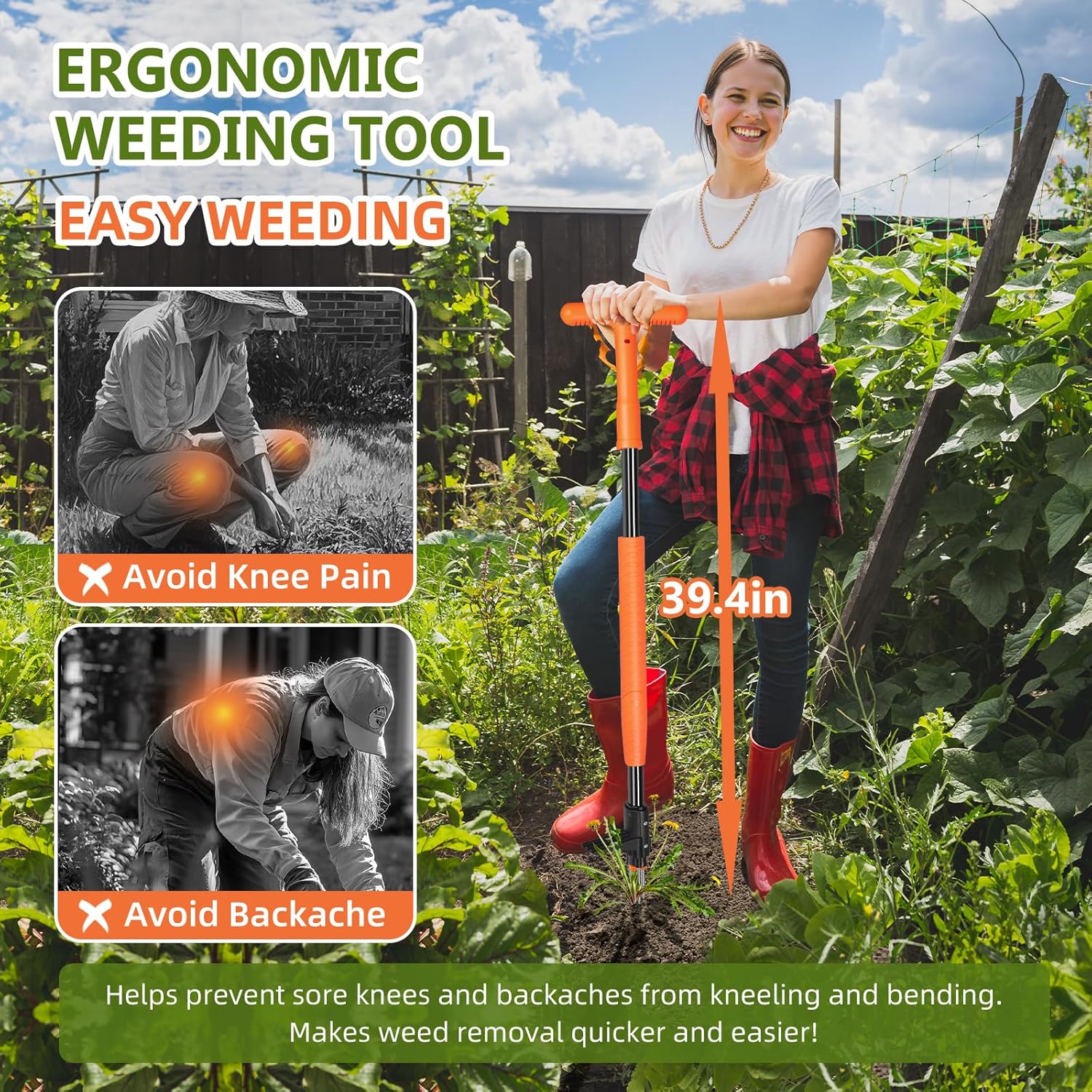 • MANUAL WEEDER TOOL -- Our weed puller comes with a 39-inch handle for a comfortable experience for most users. Featuring an ergonomic design that reduces stress on your back and wrists during weeding, making you more comfortable in your garden.The handle is designed with a non-slip texture to maintain a firm grip even in wet environments, ensuring safety and convenience during use.