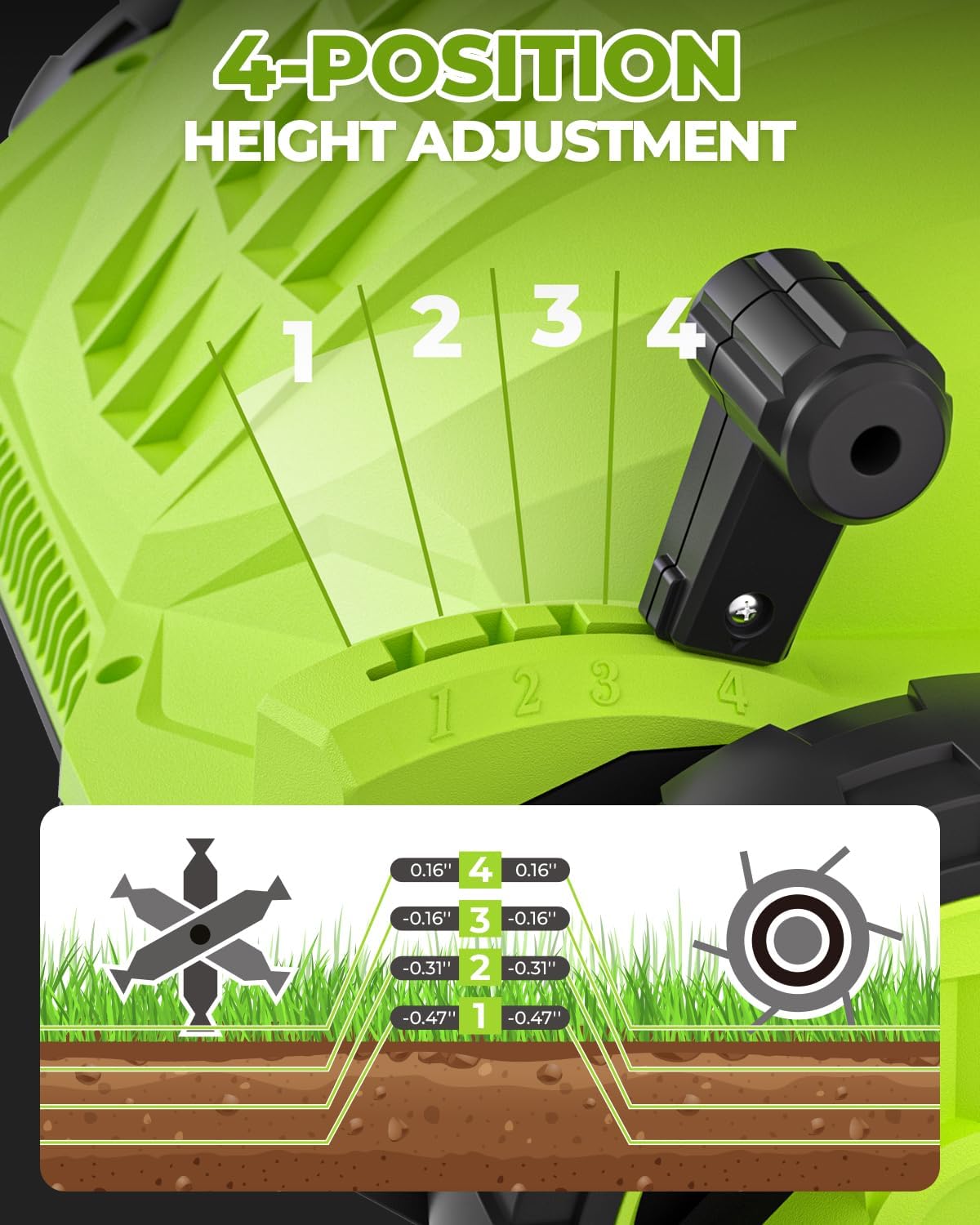 • 4-POSITION DEPTH ADJUSTMENT: Easy-to-operate lever easily adjusts the working depth from -0.47" to 0.16" to meet different lawn depth needs, convenient for lawn health maintenance work in different seasons.
