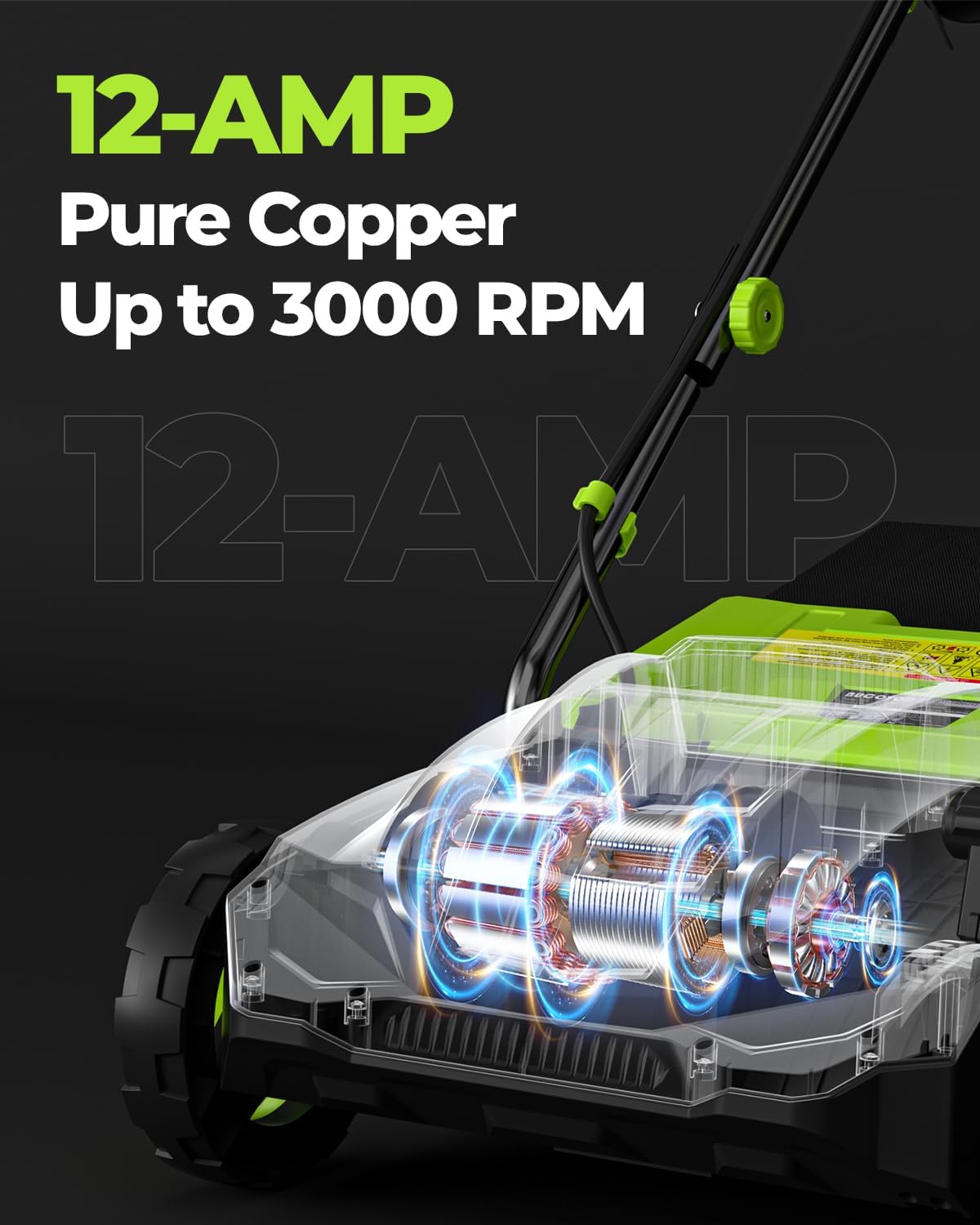 • 12AMP Powerful Motor: BUCOTOD 13-inch working width lawn electric dethatcher and scarifier is boasded with a 12-Amp pure brass motor with a no-load speed up to 3000 rpm to ensures efficient and consistent grass raking and scarifying.