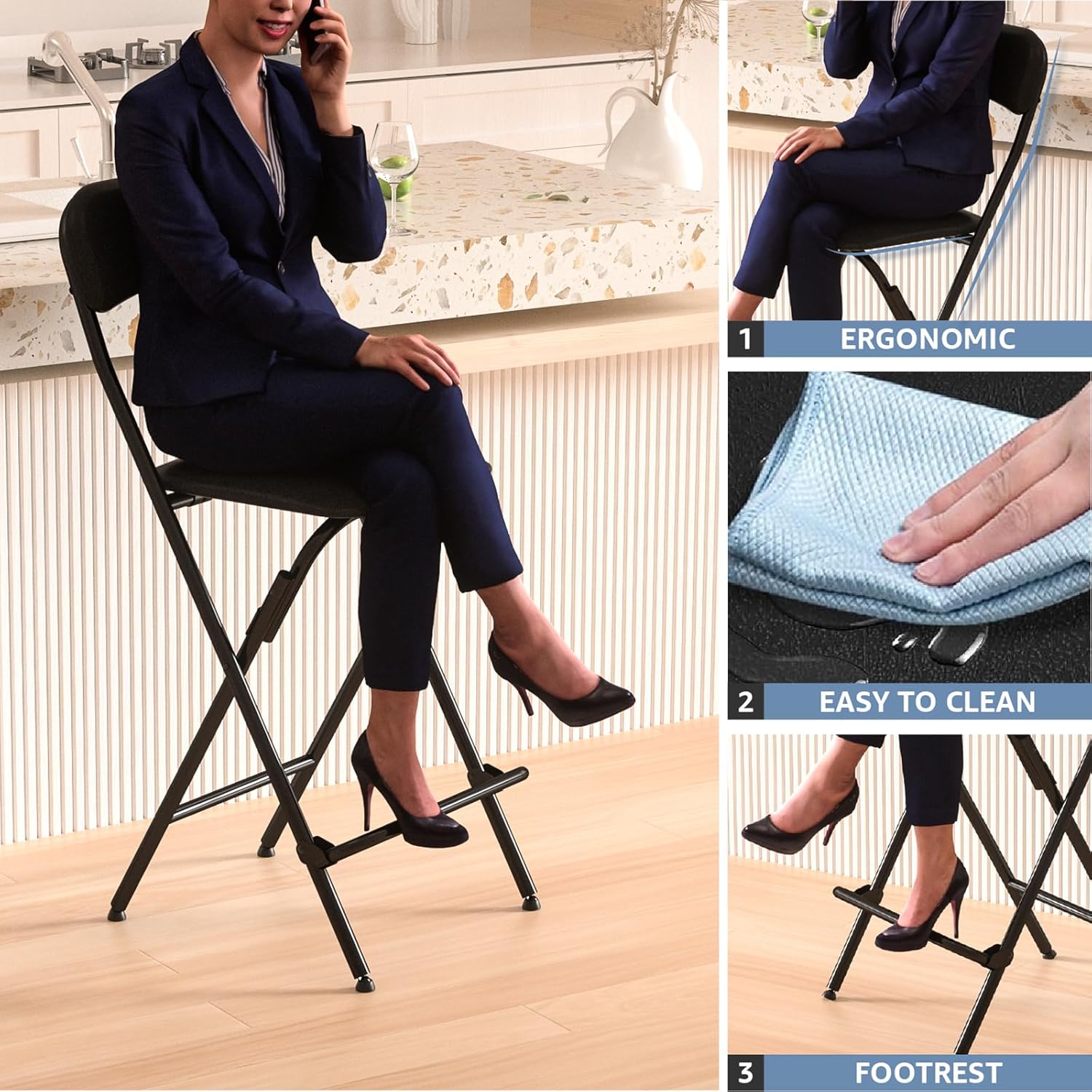 • Foldable Design: The folding bar stool is designed to be easily folded and stored, The foldable bar stool is easy to fold and store, has a small footprint, Suitable for indoor and outdoor, easy to clean up, waterproof material, easy to carry when you go out