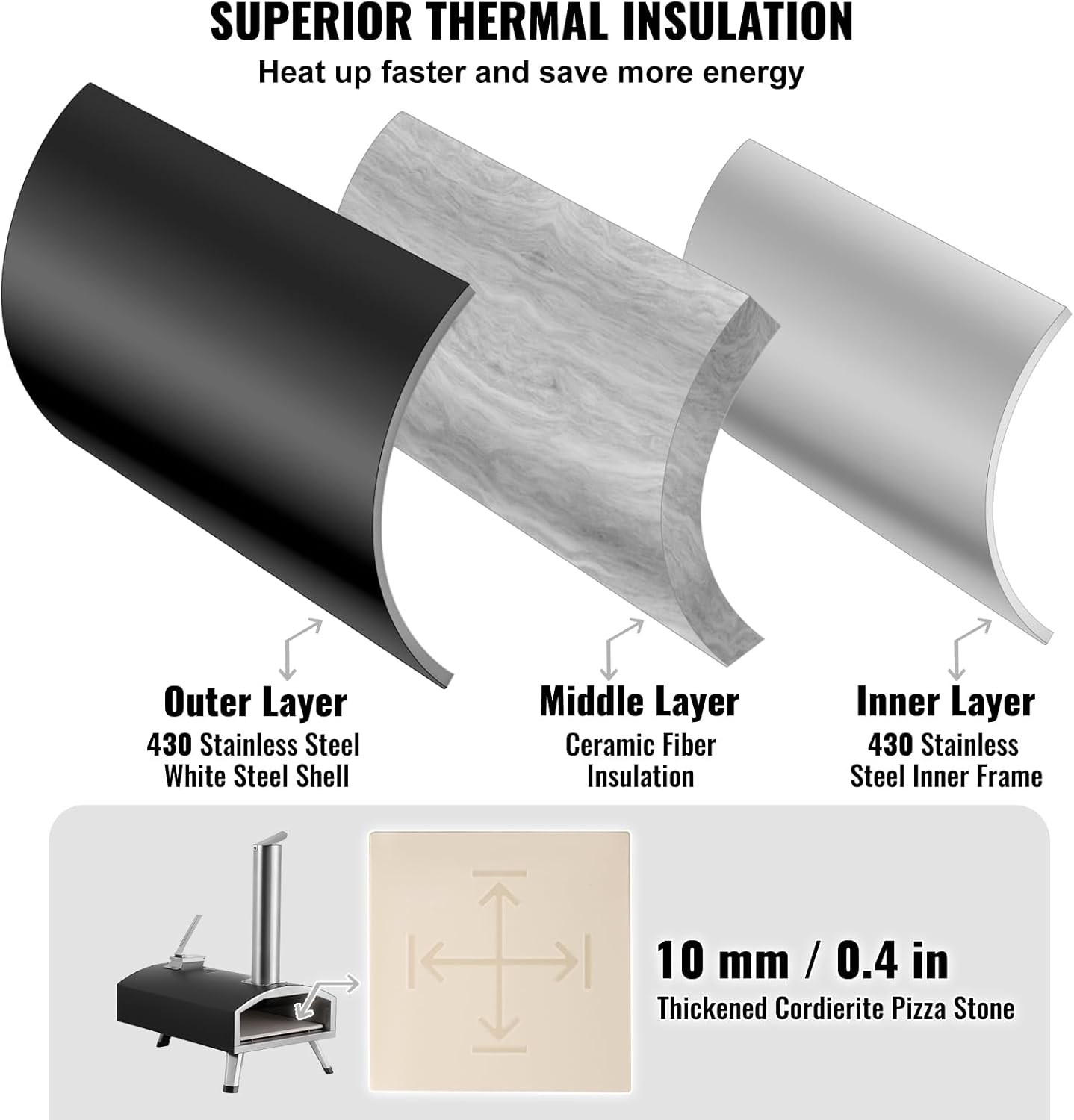 • 🍕 Durable Construction: VEVOR pizza oven withstands outdoor conditions and frequent use. Adopted a 3-layer design, promoting efficient heat circulation. Featuring a 430 stainless steel shell, and thick insulation cotton, it ensures durability and excellent heat retention