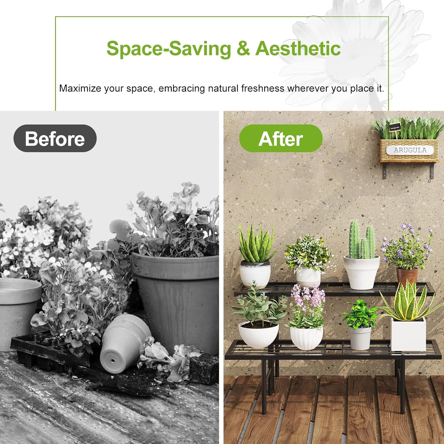 • 【Flexible Arrangement】This narrow plant rack, 8.66" wide per unit, fits any home corner. Standalone design lets you arrange in tiers, separate, or use as corner shelves, showcasing plants flexibly in various setups.
