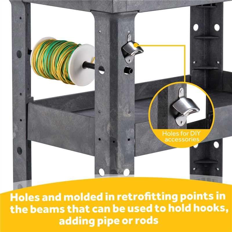 • 🔆 ERGONOMIC HANDLE AND CUSTOMIZABLE FITTINGS: Our service cart ergonomic push handle is molded into top shelf with a built-in storage compartment, which provides optimum hand placement and pushing height to improve control & worker safety. Molded In Retrofitting Points in beams allow you to add pipe or rods to hold wire spools and other roll type goods.