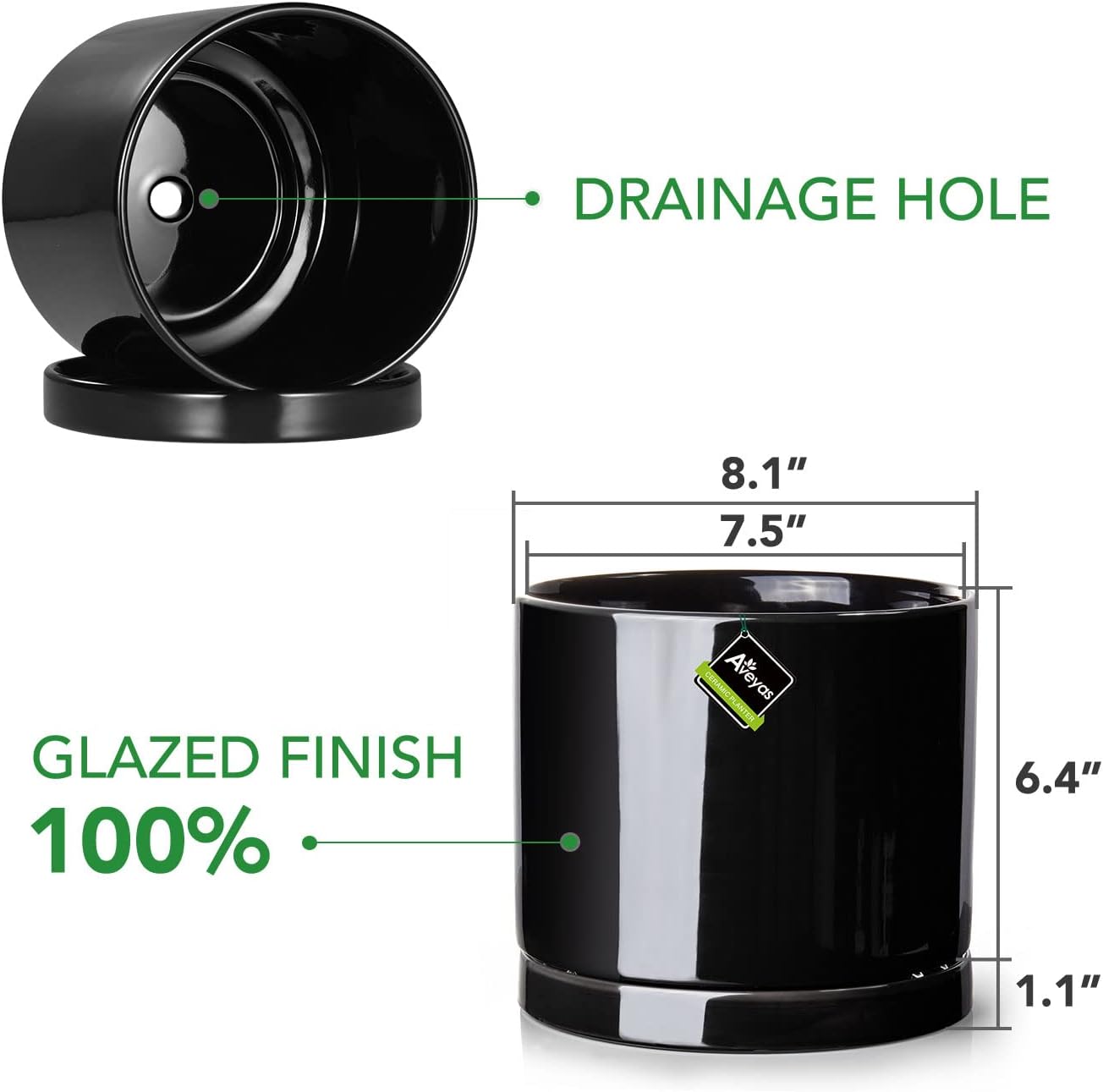 Aveyas 8 inch Ceramic Plant Pot with Drainage Hole and Saucer - Suitable for Indoor and Outdoor Use, Modern Planters for House Garden Flower Tree Snake Monstera Plants (8", Glossy Black)