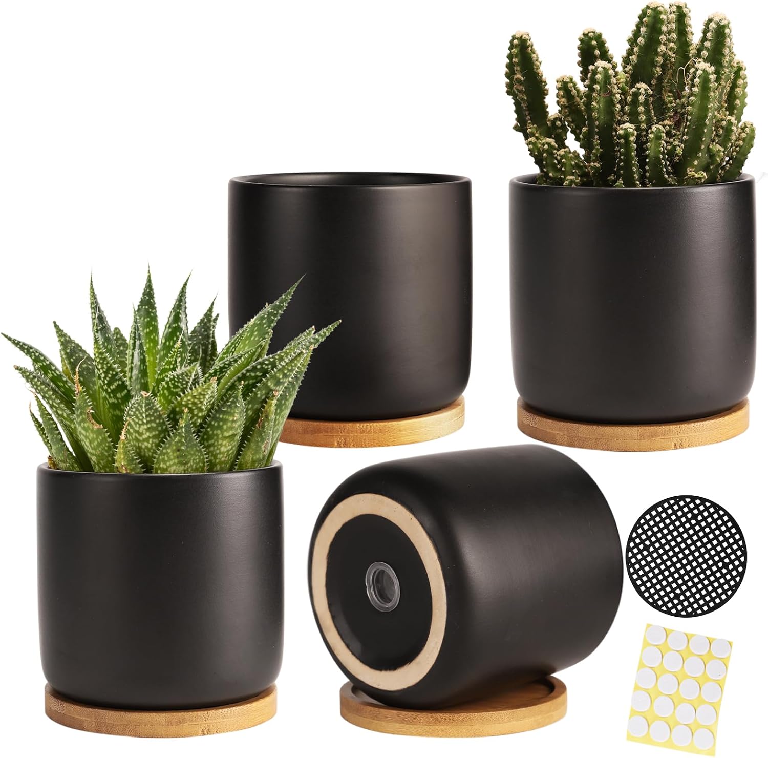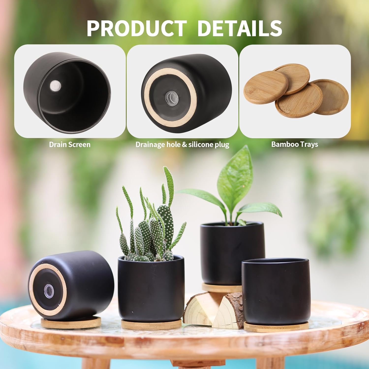 4 Inch Ceramic Plant Pots with Drainage Holes and Trays, Adorable Small Cylinder Flower Planter Pot for Indoor Plants, Succulent, Snake Plants, Cactus & Herbs, Black, Set of 4