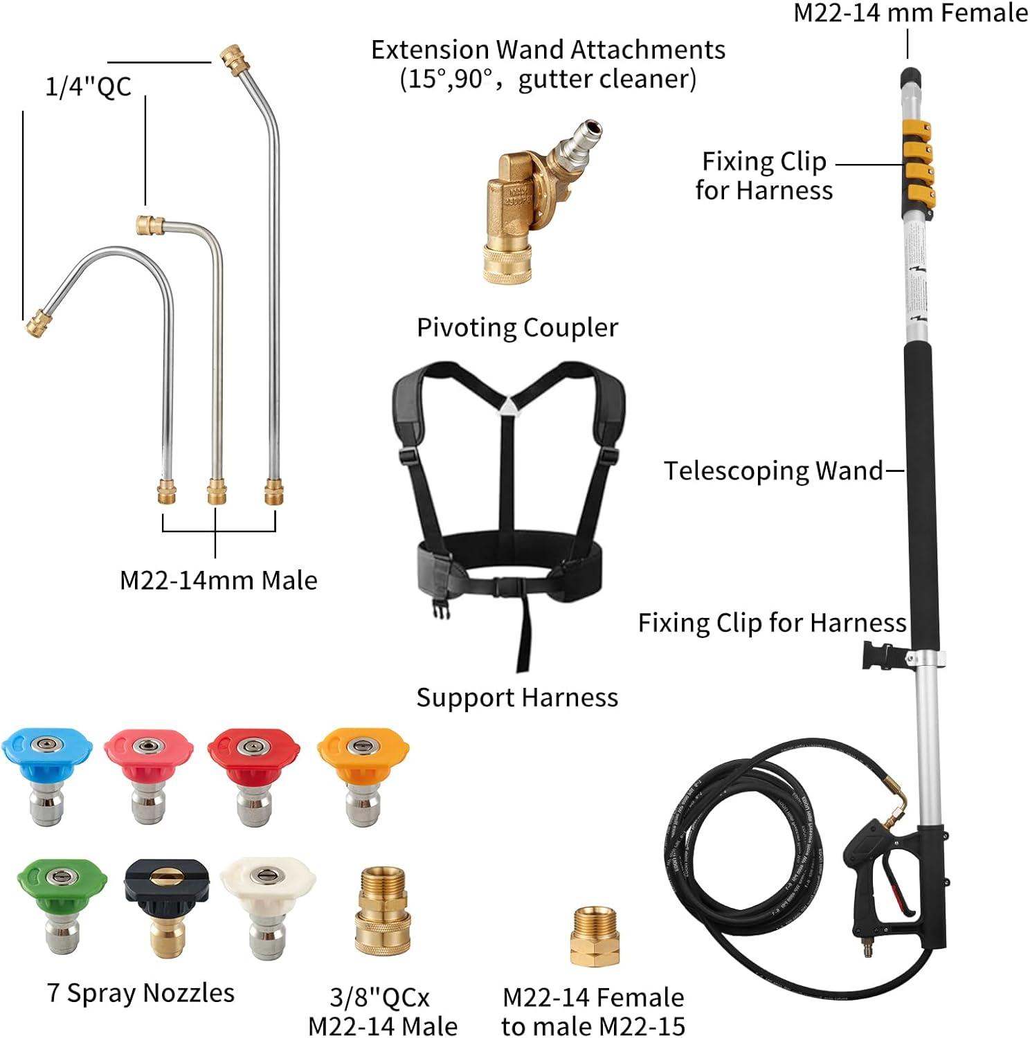 • 【Professional Cleaning】 Tecoloy telescoping pressure washer wand with 4 stage design can clean up to 24 feet high without a ladder.There are 4 adjustable sections with lever locks,set up the length you need, then lock it down for even results.Equipped with 2 extension wands,it can easily reach soffits, fascia, siding & gutters from the ground