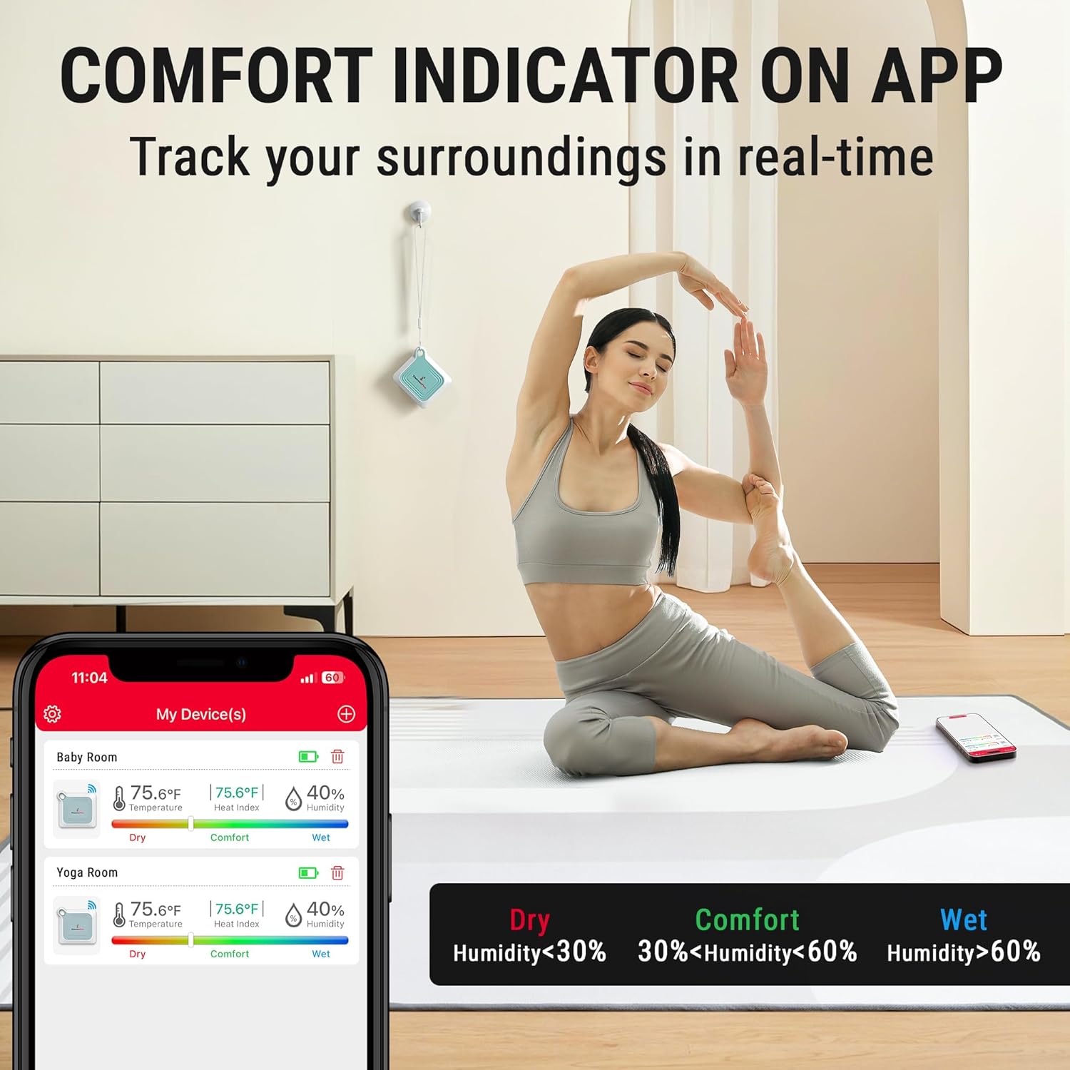 • 【Feature-Rich App】Our indoor thermometer comes with a feature-rich app, including temperature and humidity alerts, comfort index, online 1-year data chart tracking, data export, battery indicator, giving you complete control over your environment