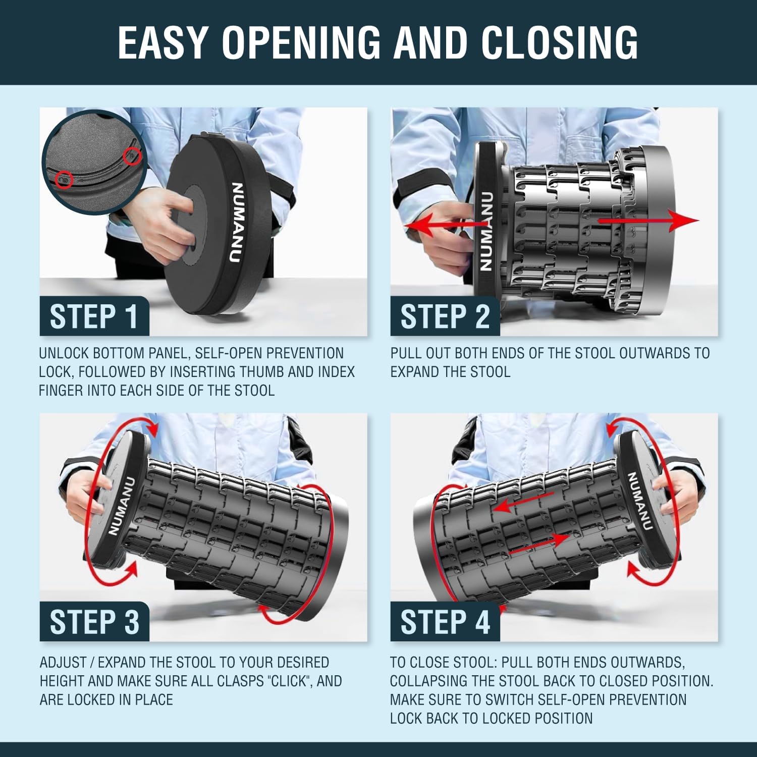 • 🔒【SELF-OPEN PREVENTION LOCK】Most Telescoping Stools do not properly lock and slip out unexpectedly while Collapsed / Closed. NUMANU's Telescopic Foldable Retractable Seat is always securely locked in place with our open-prevention Safety Lock.
