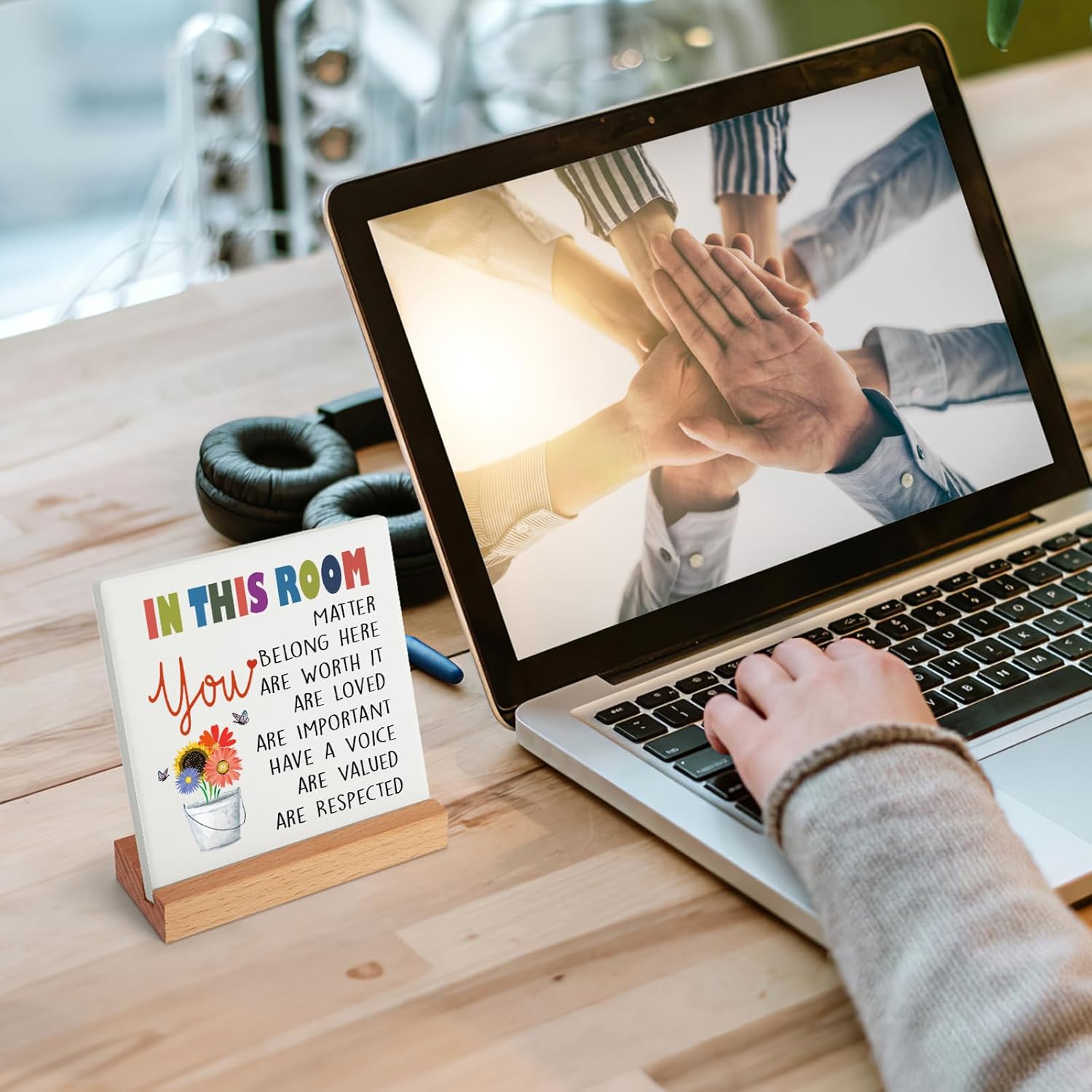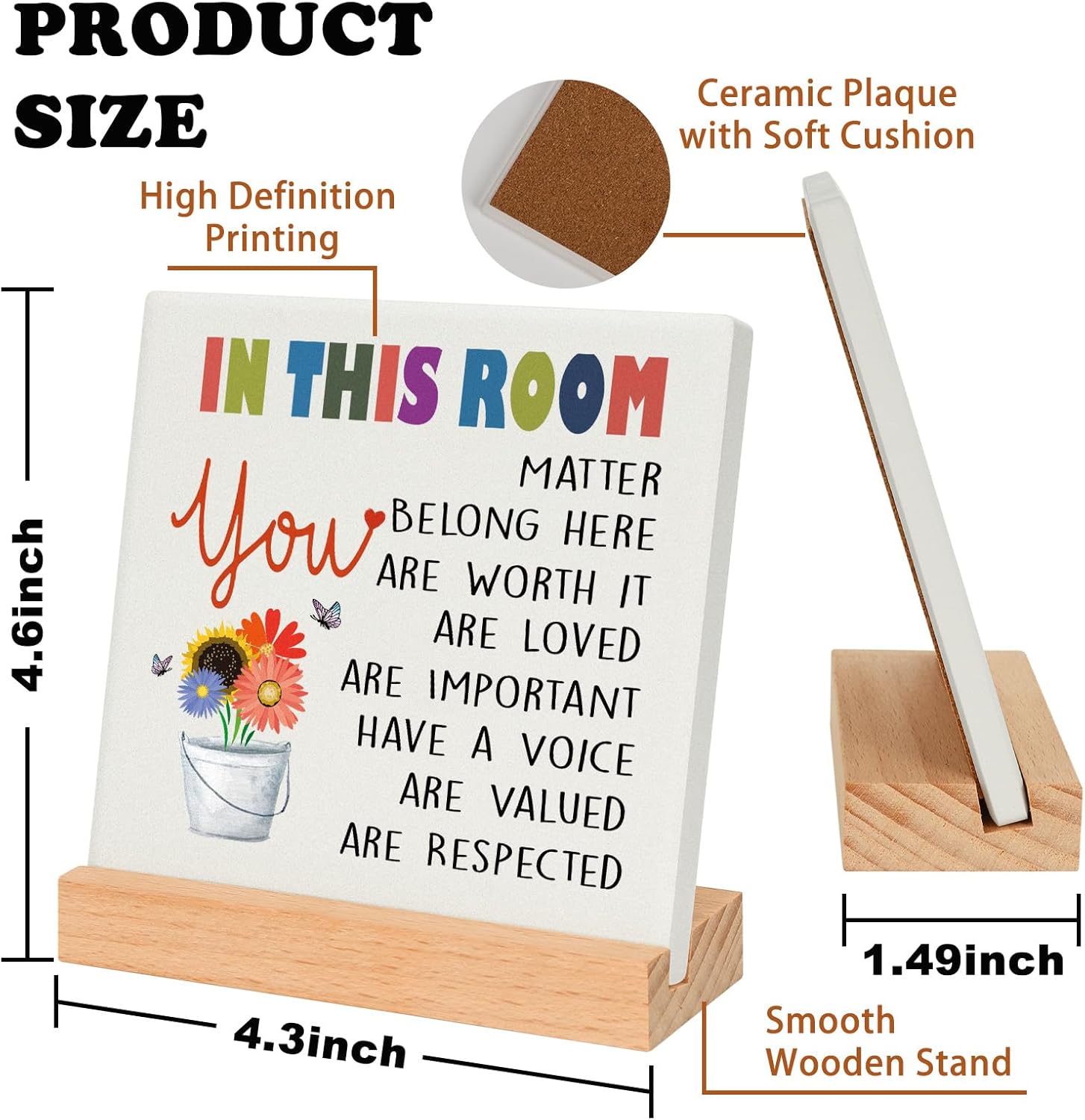 • Positive Daily Reminders for Desk Accessories: The Uplifting Little Reminders “IN This Room: YOU MATTER, BELONG HERE, ARE WORTH IT, ARE LOVED, ARE IMPORTANT, HAVE A VOICE, ARE VALUED, ARE RESPECTED.” are Made from good-quality and well packaged in a box. It can express encouragement and conveys the artistic touch. It is easy to carry and takes up less space with a 4.3"x4.3" eye-catching ceramic plate and a L4.3"x W1.5" smooth wooden base. Suitable for gift giving to friends, Teenage, graduates, colleagues and college girls, etc. Give them positive energy and inspiration with this delicate emotion cheerful support gift.