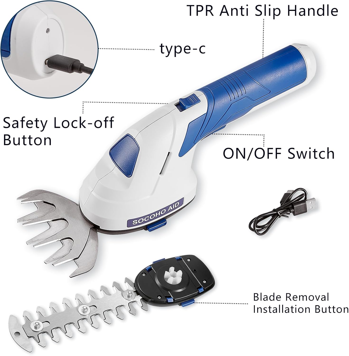 Cordless Hedge Trimmer Grass Shear - 2 in 1 Handheld 7.2V Electric Shrubbery Trimmer Grass Cutter Rechargeable Battery and Type-C
