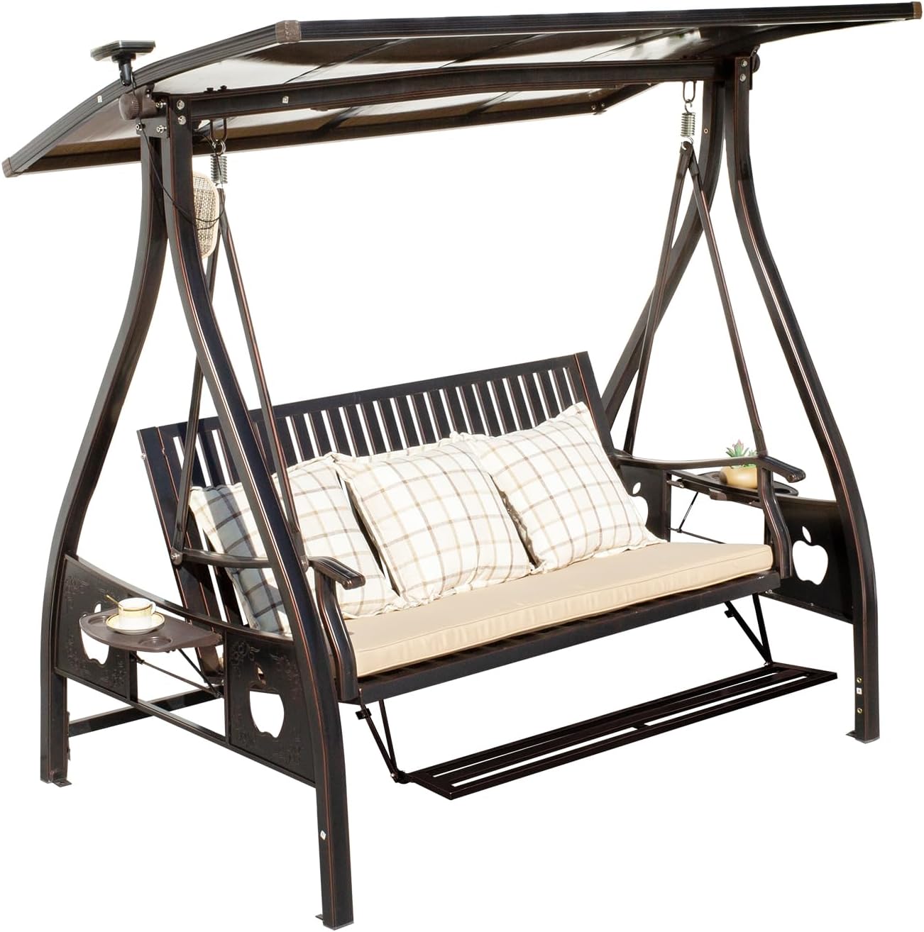 • Adjustable Aluminum Alloy Canopy: Upgraded designed with an adjustable hardtop aluminum alloy board canopy, which is built to last and is not easy to deform. The all-weather hardtop canopy protects against UV rays and rain. Porch swing with solar receiver, energy saving and environmental protection, more convenient