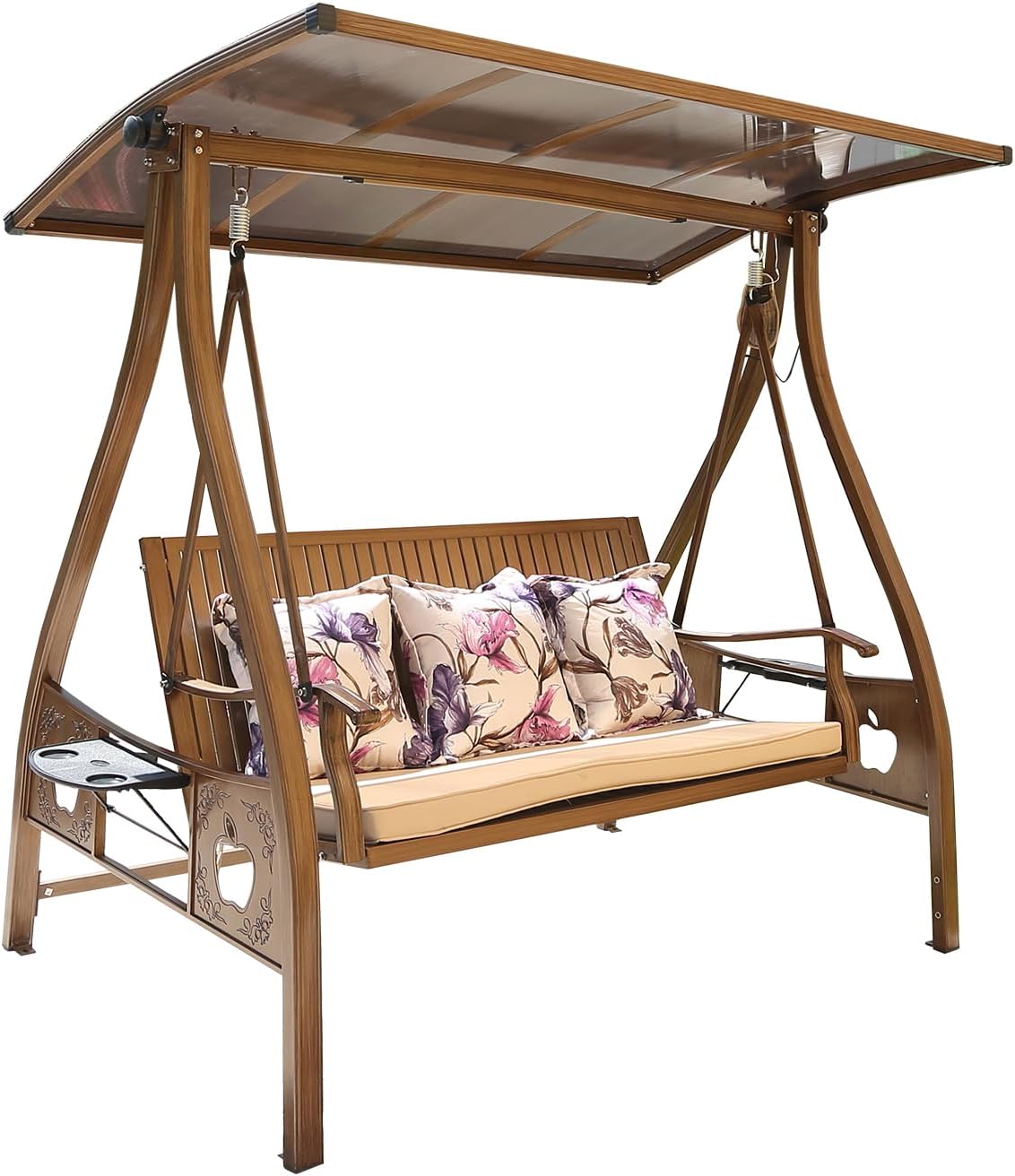 2/3-Seat Outdoor Patio Porch Swing with Adjustable Aluminum Alloy Canopy Solar Patio Swing Chair Bench with Footrest Side Cup Holder for Backyard Lawn (Elite Wood Grain-3 Seat)