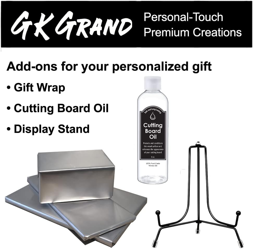 • BEAUTIFUL MATCHING GIFT ADD-ONS: Enjoy a great shopping experience as we offer matching gifts with the exact engraved design as your walnut board, pick and choose from some of the following items, Charcuterie board, Tumblers, Coasters, we also offer display stand meant for this board, Gift Wrapping, send your gift with confidence directly to the recipient knowing we have everything covered with an excellent gift presentation.