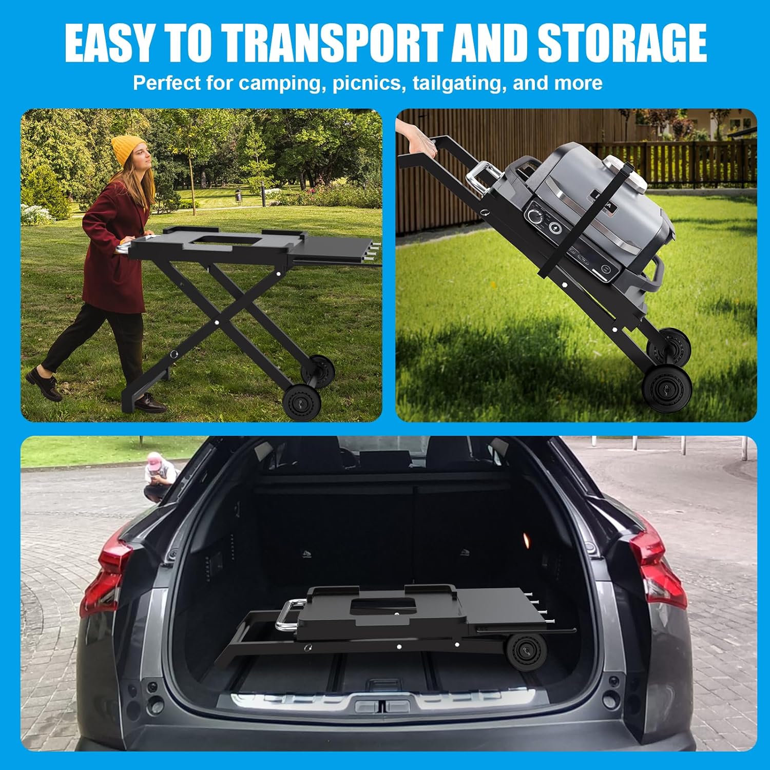 • COLLAPSIBLE DESIGN-The folding legs of our outdoor grill cart enable easy storage and transportation. It can be easily carried and stored in your car, garage, or RV. Perfect for camping, picnics, tailgating, and more