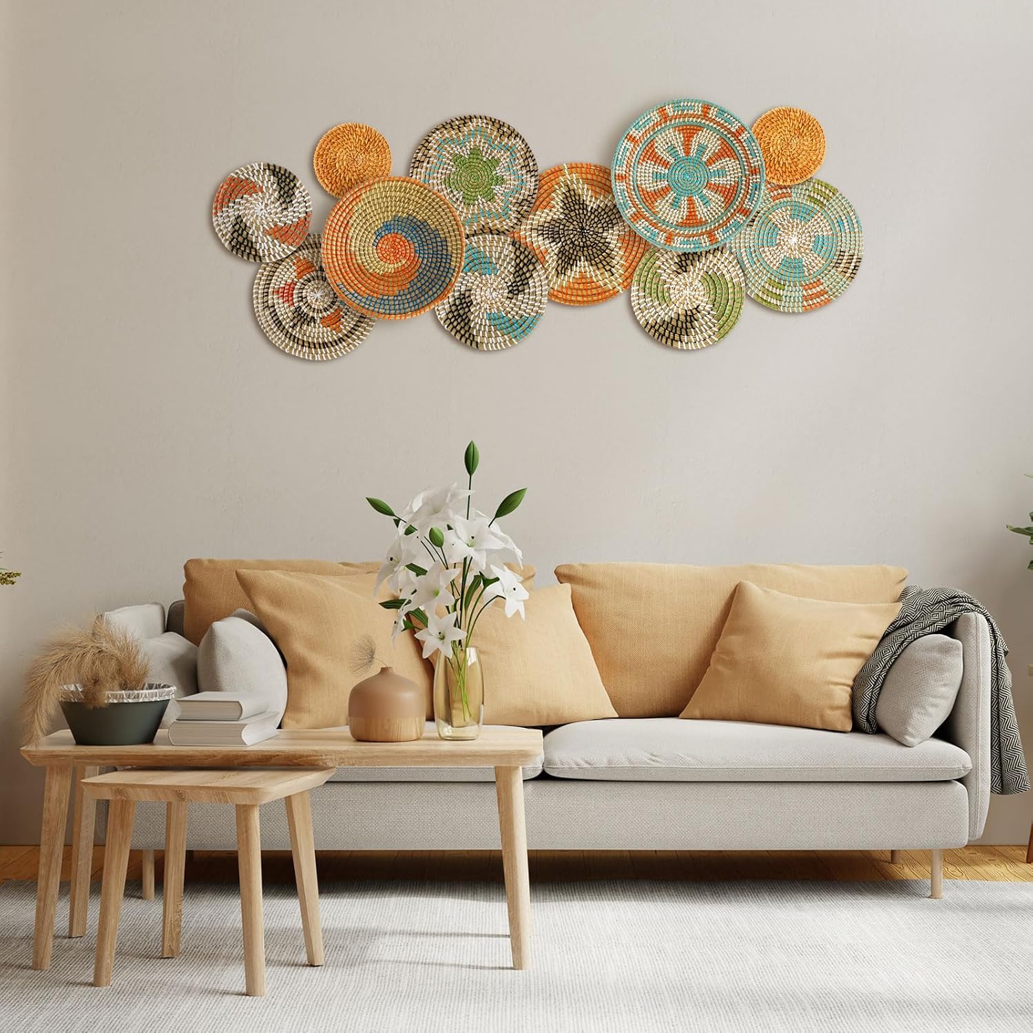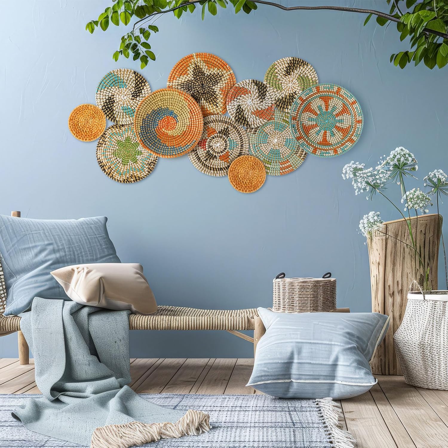 • Wide Range of Applications: boho basket wall decor set as placemats, or as decorative baskets to store toys and accessories, the rustic basket wall art is suitable for many occasions, such as hotels, restaurants, living rooms, bedrooms, schools, stores, offices, dorms, shops, Christmas and more, bringing you an elegant and classic feeling