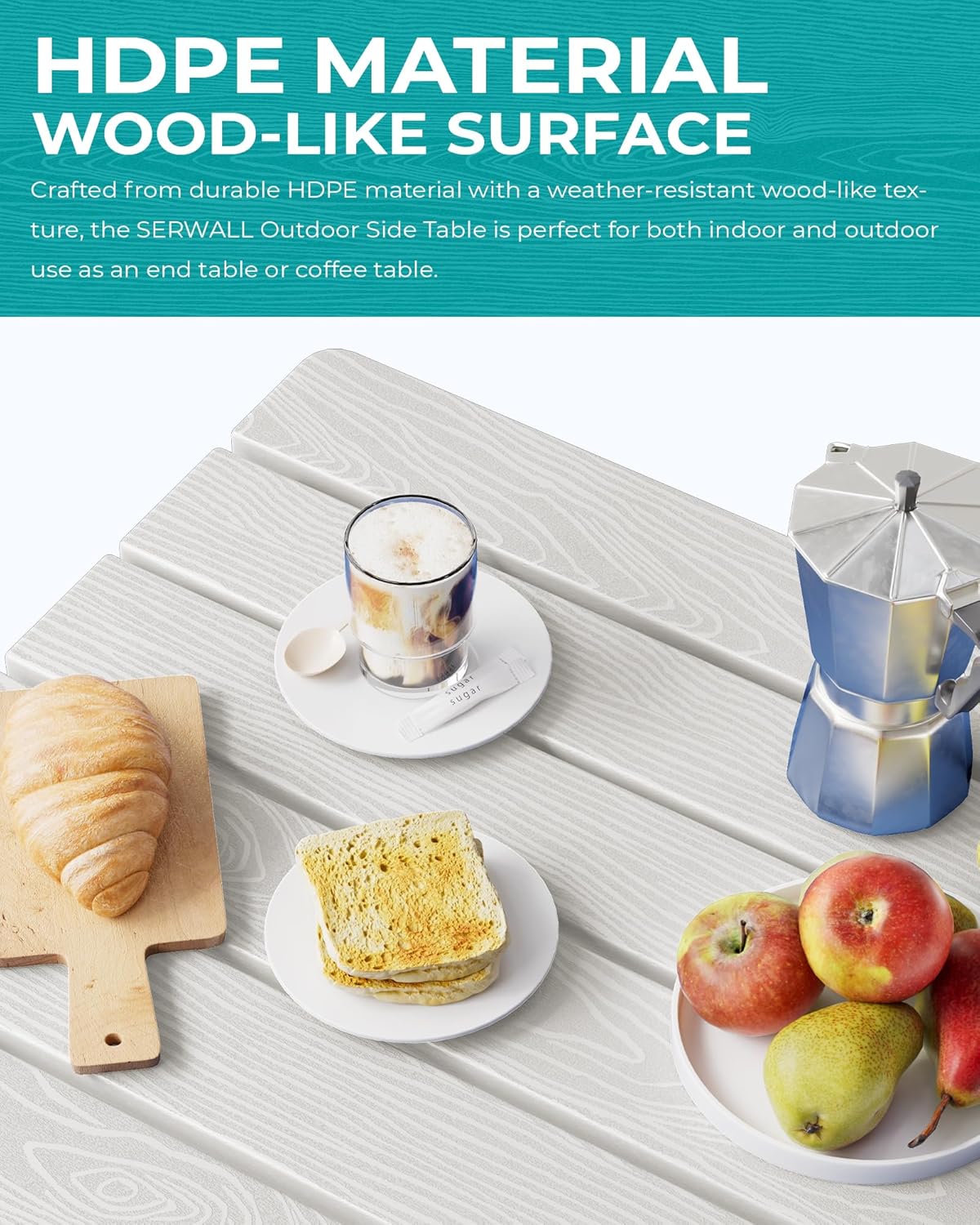 • [Premium Wood-Textured Surface] Offering the aesthetic appeal of wood without the upkeep, the SERWALL Side Table features a wood-textured HDPE surface that adds an elegant and natural touch to your outdoor decor.