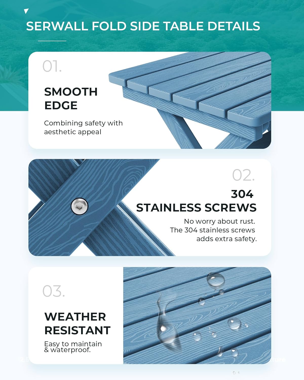 • [Foldable Outdoor Side Table] The SERWALL Adirondack Side Table features a foldable design that significantly reduces its footprint when folded, providing an optimal space-saving solution for outdoor enthusiasts.