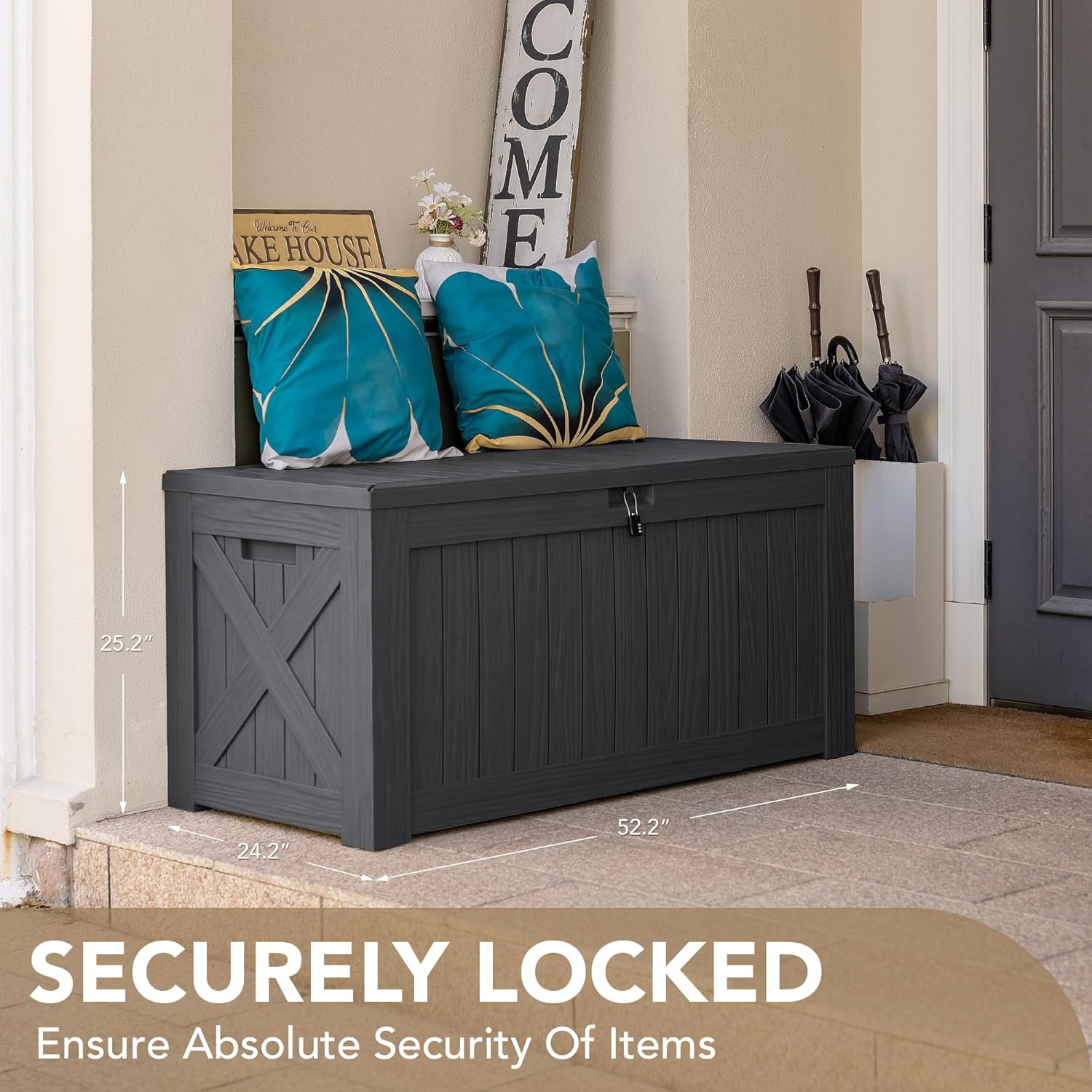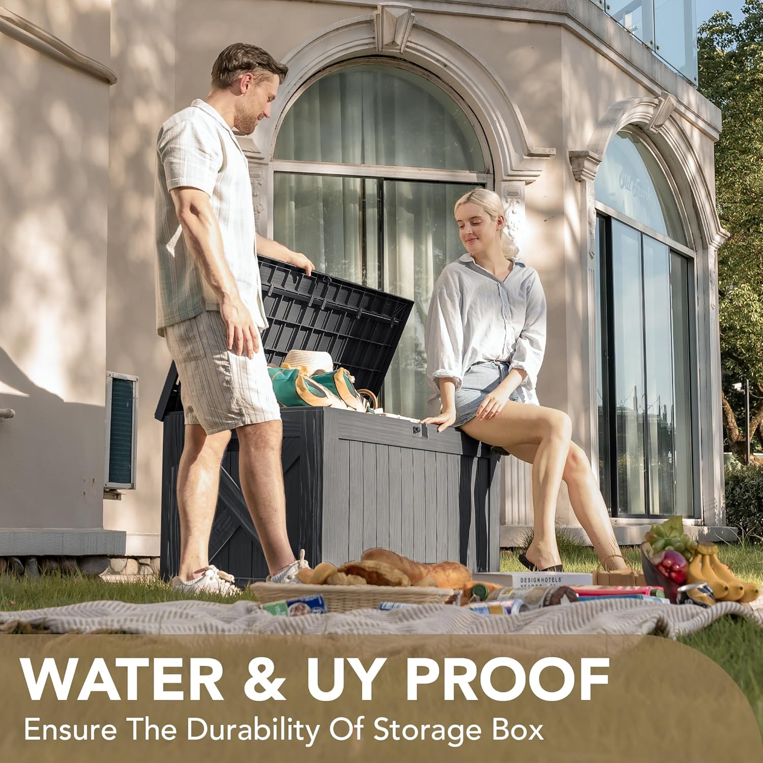 • High-quality Resin: The deck storage box is made of water-resistant resin, complemented by a wood like grain design that maintains a fresh look even with all-weather use