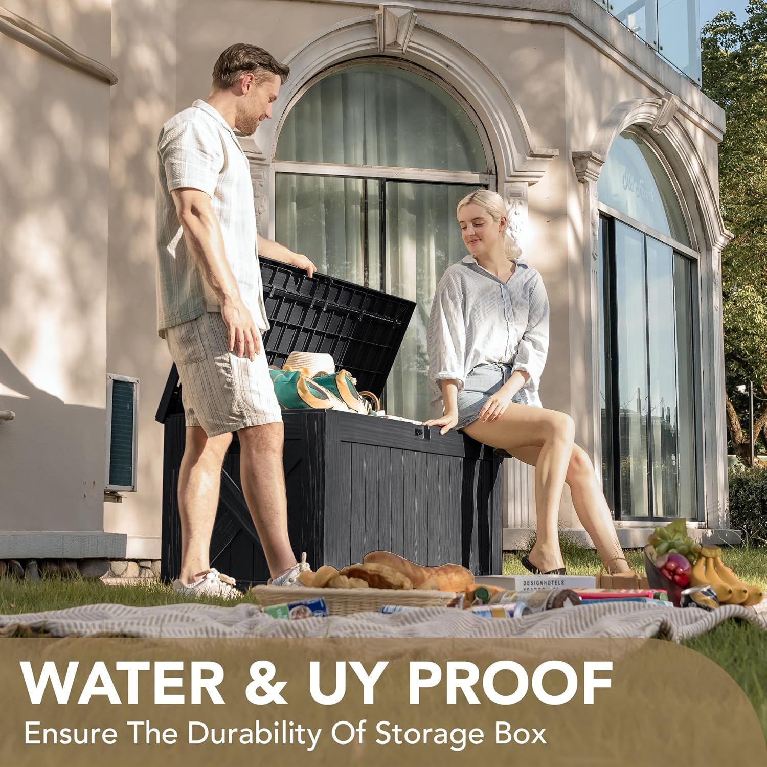• High-quality Resin: The deck storage box is made of water-resistant resin, complemented by a wood like grain design that maintains a fresh look even with all-weather use