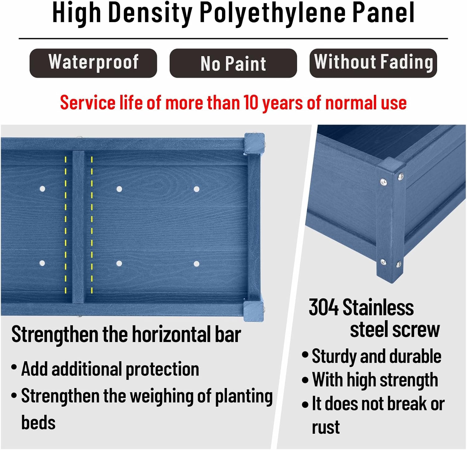 • Quality Materials: Elevated planter box is made of HDPE, It is waterproof, resistant to corrosion, does not crack, less prone to fading, weather-resistant,easy to clean,offering more advantages than wooden raised garden beds