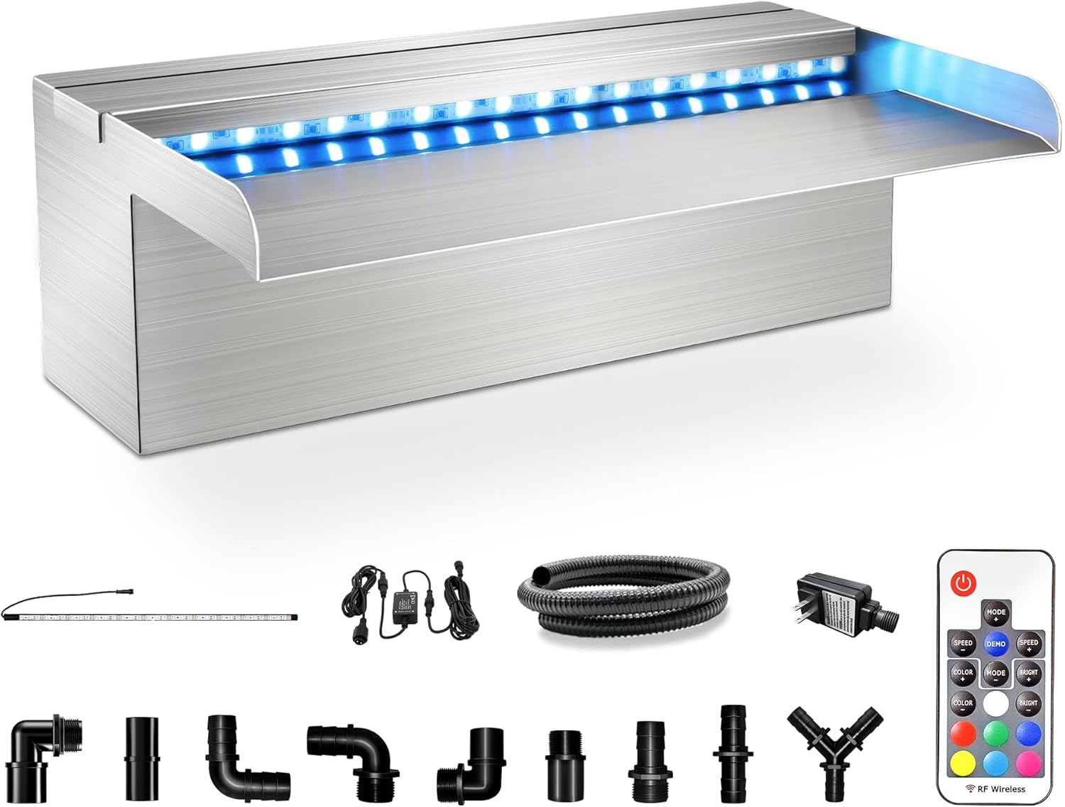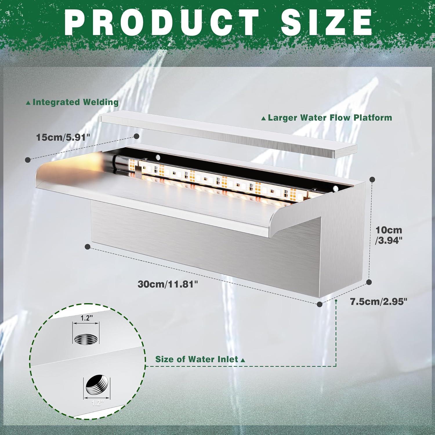 • 【Stainless Steel Waterfall】 The main body of the stainless steel waterfall spillway is welded together using 304 stainless steel, providing durability for long-term use, ensuring rust-proof and no water leakage. The open lip design creates an elegant, invigorating freefalling water effect for your swimming pool or pond