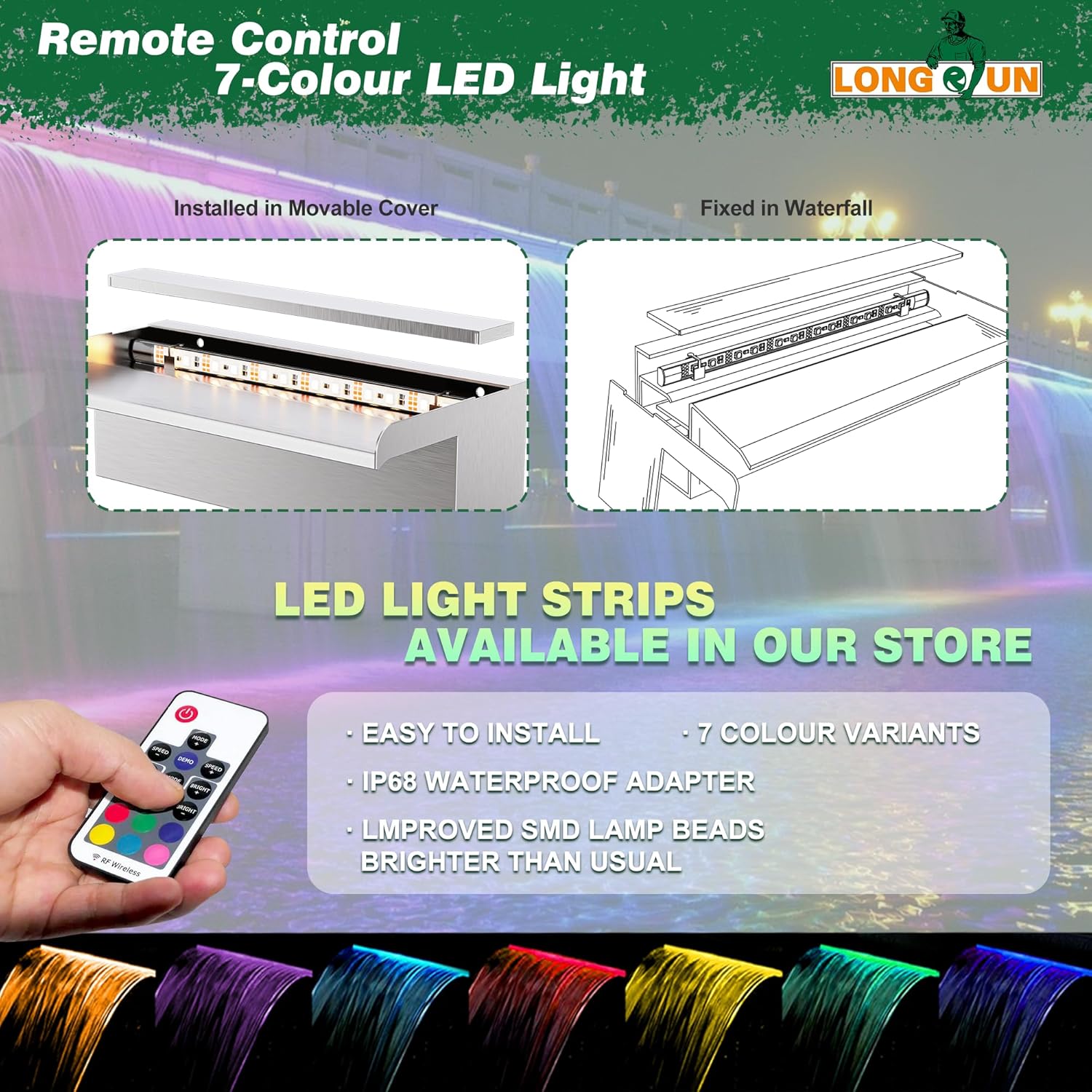 • 【Upgrade SMD LED】The upgraded IP68 waterproof SMD LED light strip will be brighter than ordinary light strips. It can be installed on movable covers or fixed behind waterfalls using double-sided tape, creating two different lighting effects. The color, brightness, and mode speed can be changed using the included RF remote