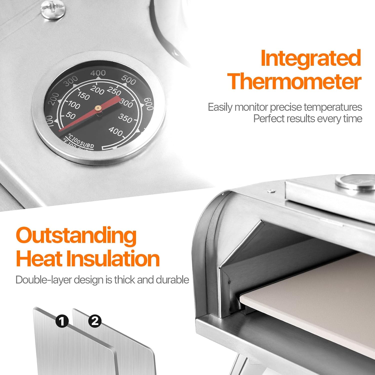 • Done in Minutes: Our outdoor pizza oven has a built-in thermometer so you can easily monitor the temperature inside the oven to track cooking progress. Heats up to 752°F in just 15 minutes and reaches a maximum temperature of 1,022°F. When preheated, the 13'' cordierite pizza stone bakes pizzas to crispy perfection in 90 seconds or less, as well as steaks, fish, lamb chops, burgers, salmon, vegetables and more