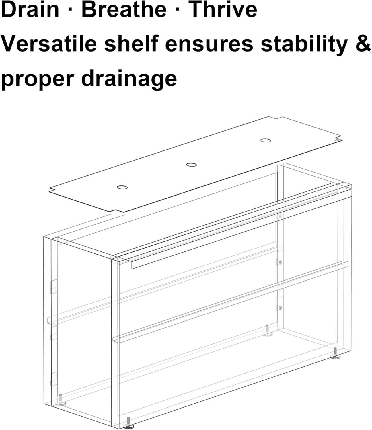• Built-In Shelf with 3 Drainage Holes & Four Stable Legs for Airflow and Surface Protection The internal shelf efficiently drains excess water to prevent root rot, while four sturdy legs elevate the planter to improve ventilation and protect floors or furniture.