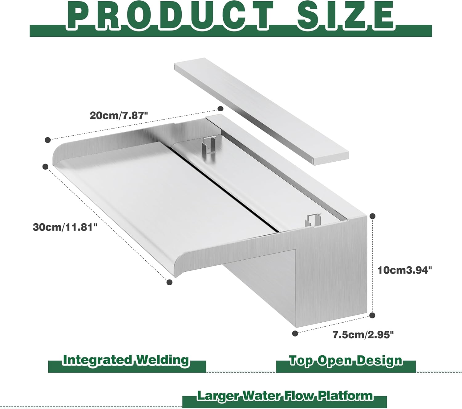 • 【Anti-Rust Spillway Waterfall】- The main body of this stainless steel spillway waterfall is welded together using 304 stainless steel for stable long-term use, featuring an top open lip design that creates elegant, invigorating, freefalling water effects to add a decorative touch to ponds and pools, letting you enjoy the relaxing sounds of water for a sense of calm and well-being. LED light strips not included, but available separately.