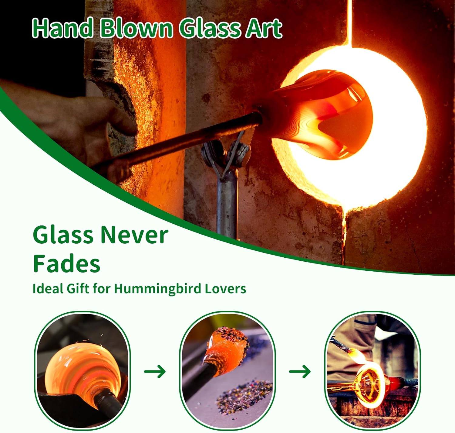 • Hand Blown: Each bird water feeder is carefully hand-blown by skilled artisans, making each one unique. The glass color is embedded within a double-layer design, ensuring bright, vibrant, and fade-resistant colors. The thick rubber ring at the bottom prevents leaks, making it a perfect addition to your garden.